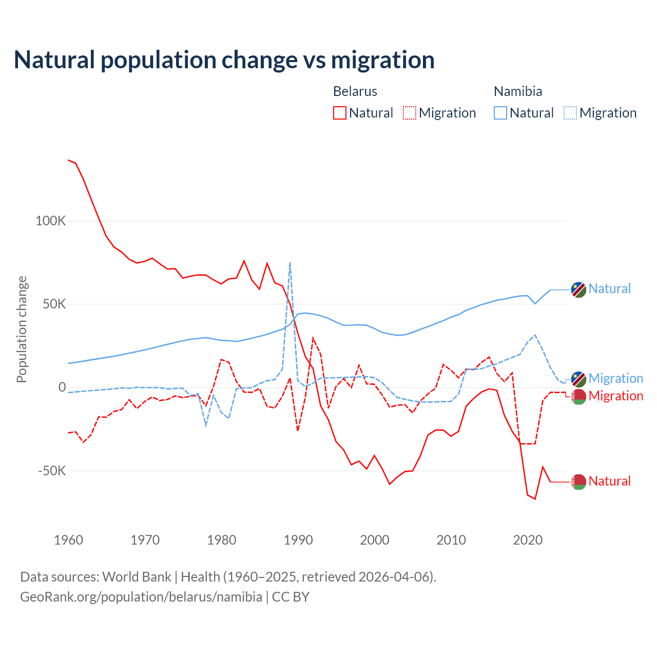 Over the last 10 years, 84.2% of the population change in Belarus is from natural causes (a loss of 318,682 people) and 15.8% is from migration (a loss of 59,605 people). In Namibia 74.3% is from natural causes (a gain of 532,532 people) and 25.7% is from migration (a gain of 183,837 people).
