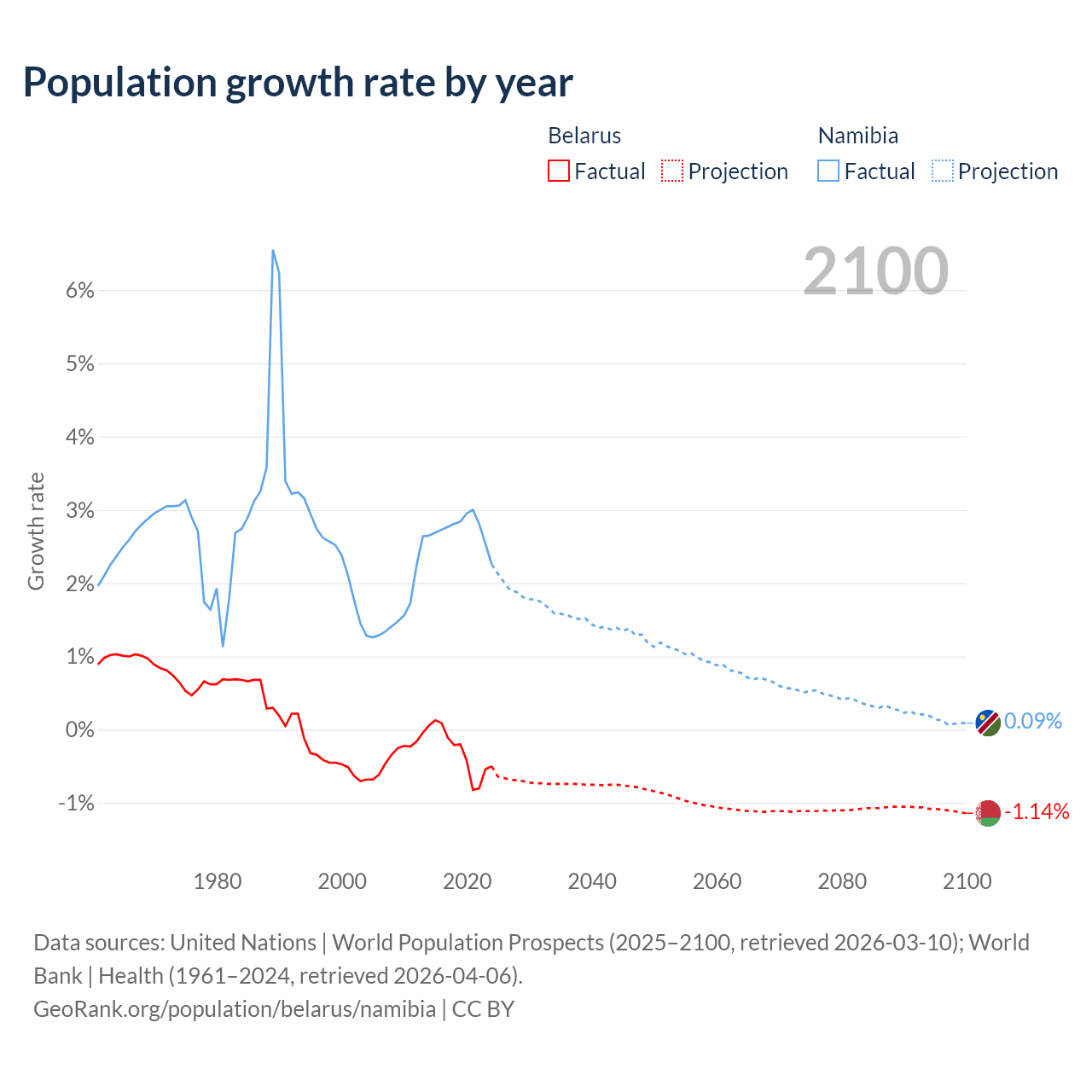- For the last 10 years, Belarus has had an average growth rate of -0.3% per year vs +2.73% in Namibia.