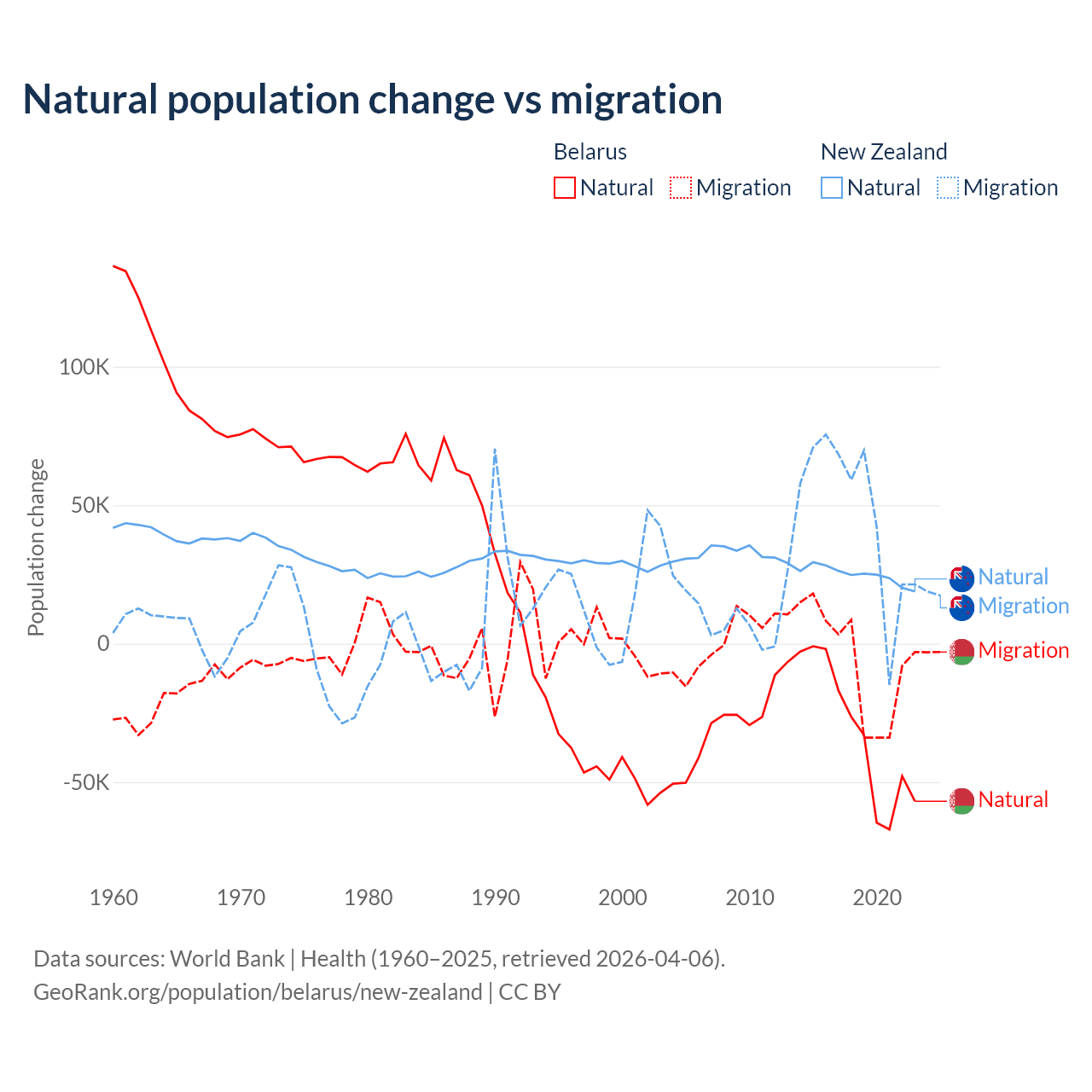Over the last 10 years, 84.2% of the population change in Belarus is from natural causes (a loss of 318,682 people) and 15.8% is from migration (a loss of 59,605 people). In New Zealand 34.4% is from natural causes (a gain of 247,767 people) and 65.6% is from migration (a gain of 471,602 people).