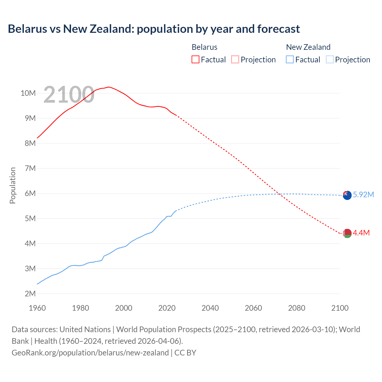 The latest officially reported population of Belarus was 9,132,629 in 2024 vs 5,287,500 people in New Zealand in 2024. In 2026, based on the adjusted UN estimation, the current Belarus' population is 9,013,835 people compared to 5,374,272 in New Zealand.