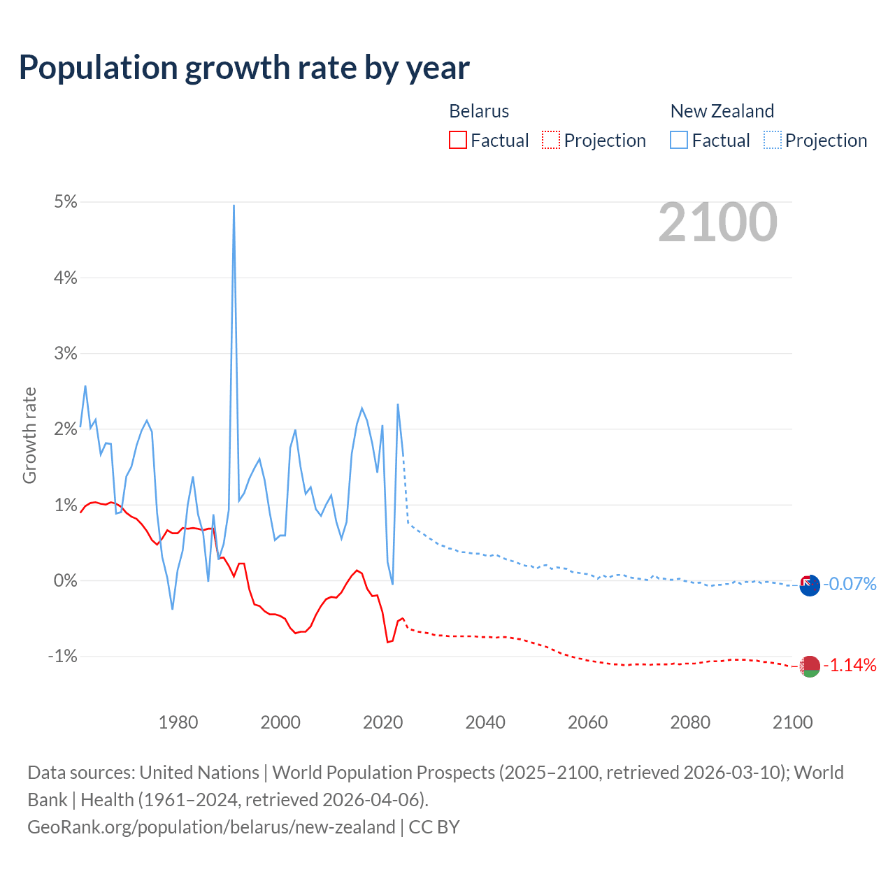 - For the last 10 years, Belarus has had an average growth rate of -0.3% per year vs +1.6% in New Zealand.