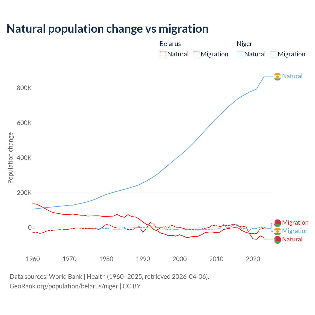 Over the last 10 years, 84.2% of the population change in Belarus is from natural causes (a loss of 318,682 people) and 15.8% is from migration (a loss of 59,605 people). In Niger 100% is from natural causes (a gain of 7,728,287 people) and 0.03% is from migration (a gain of 2,520 people).