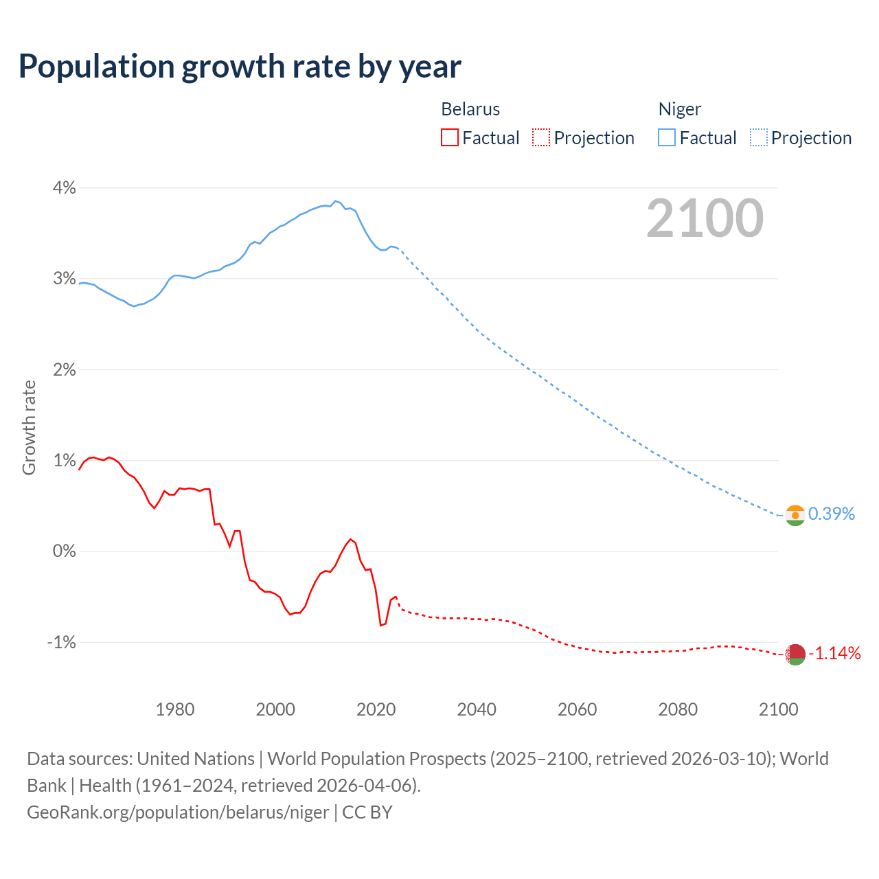 - For the last 10 years, Belarus has had an average growth rate of -0.3% per year vs +3.5% in Niger.