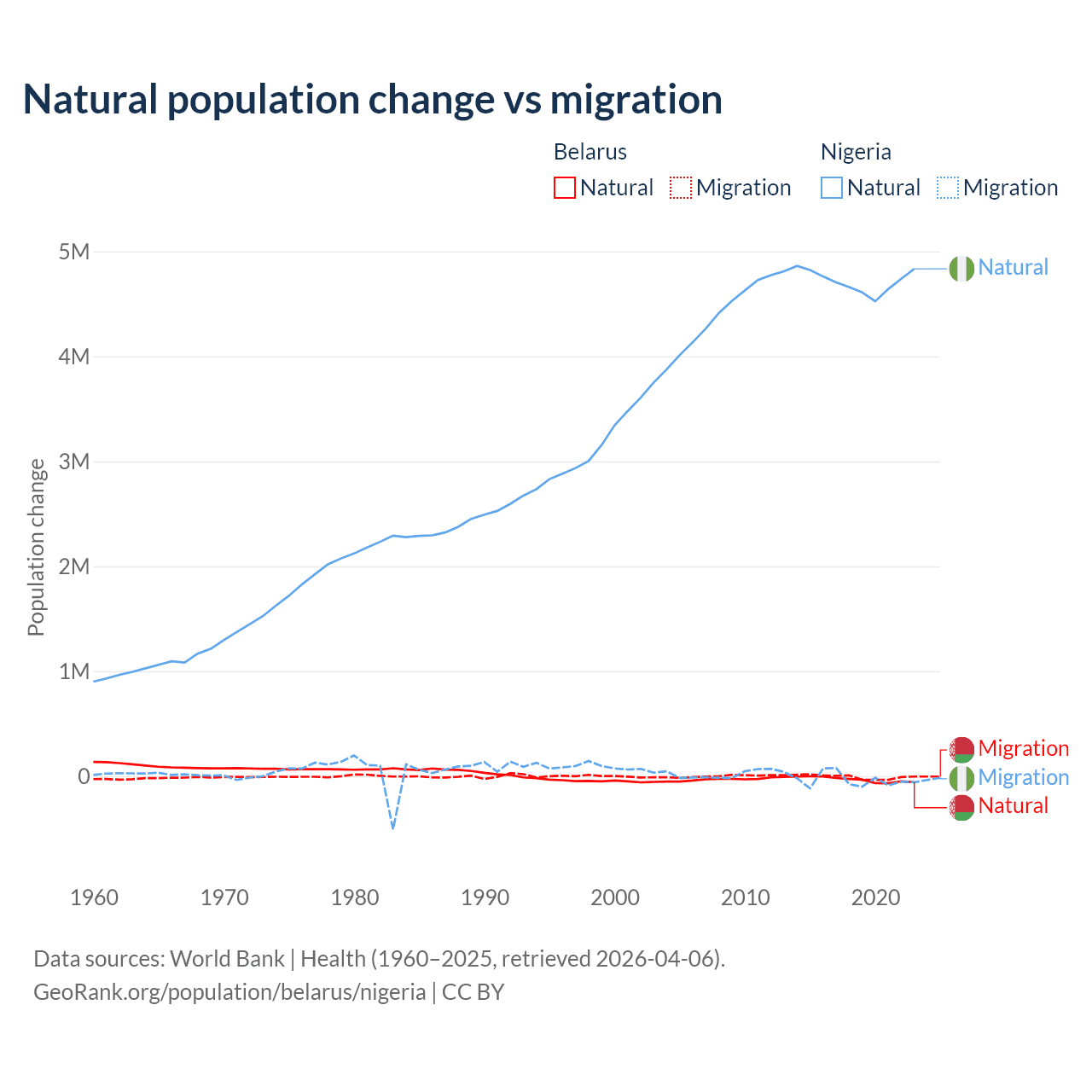 Over the last 10 years, 84.2% of the population change in Belarus is from natural causes (a loss of 318,682 people) and 15.8% is from migration (a loss of 59,605 people). In Nigeria 99.2% is from natural causes (a gain of 47,163,517 people) and 0.77% is from migration (a loss of 368,103 people).