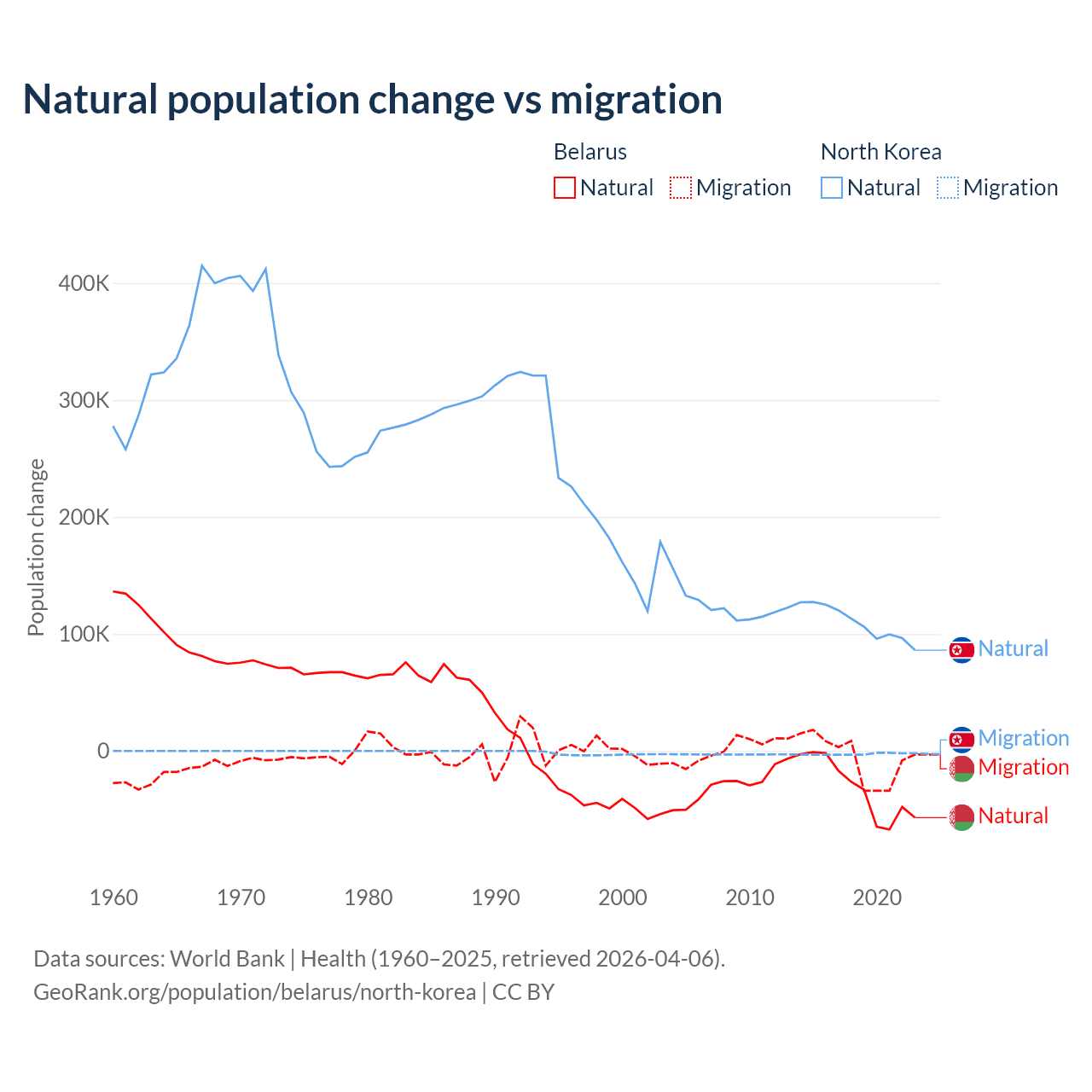 Over the last 10 years, 84.2% of the population change in Belarus is from natural causes (a loss of 318,682 people) and 15.8% is from migration (a loss of 59,605 people). In North Korea 97.7% is from natural causes (a gain of 1,097,372 people) and 2.33% is from migration (a loss of 26,227 people).