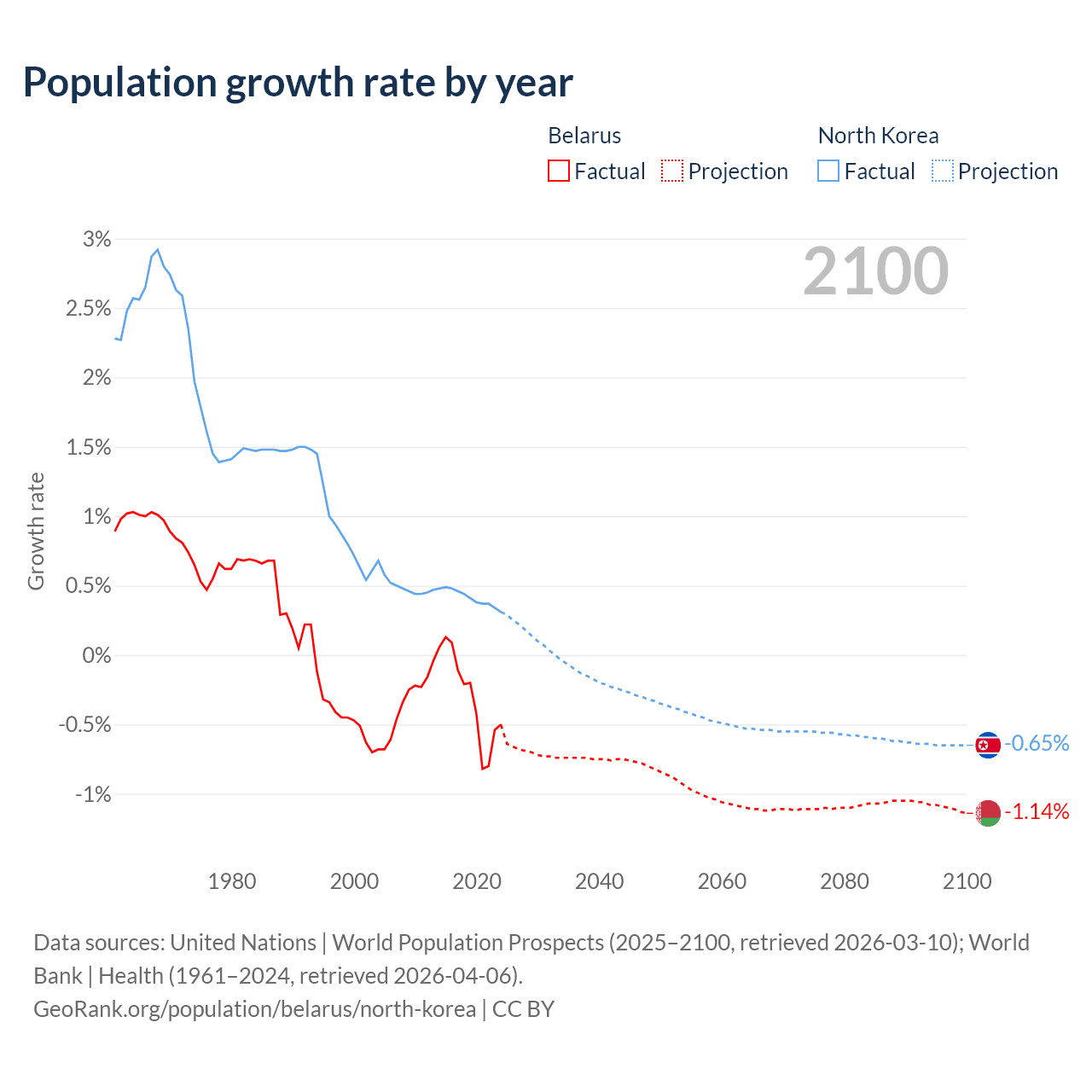 - For the last 10 years, Belarus has had an average growth rate of -0.3% per year vs +0.41% in North Korea.