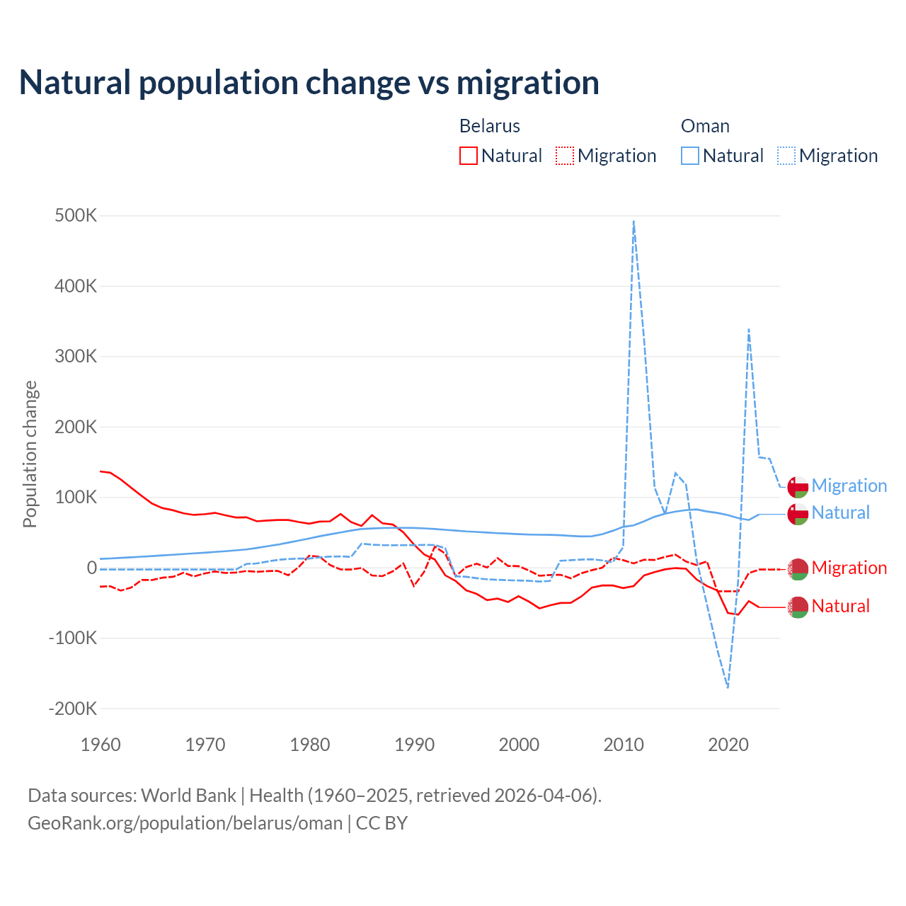 Over the last 10 years, 84.2% of the population change in Belarus is from natural causes (a loss of 318,682 people) and 15.8% is from migration (a loss of 59,605 people). In Oman 61.6% is from natural causes (a gain of 763,049 people) and 38.4% is from migration (a gain of 475,565 people).