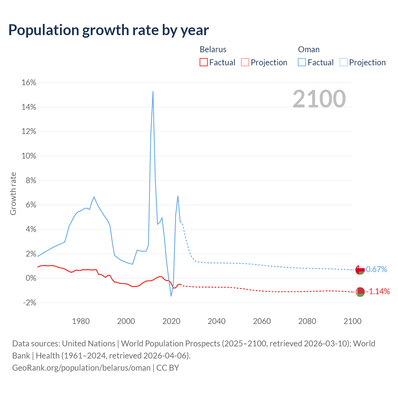 - Since 2006, the population of Belarus has decreased from 9.6M people to 9.01M (6.15% decline), while Oman has grown from 2.51M to 5.76M (129.1% growth).