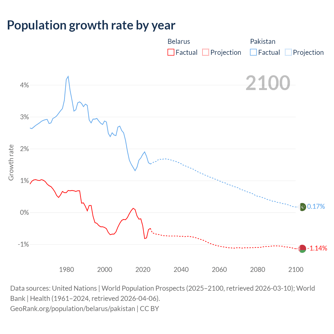 - Since 2006, the population of Belarus has decreased from 9.6M people to 9.01M (6.15% decline), while Pakistan has grown from 180M to 260M (44.9% growth).
