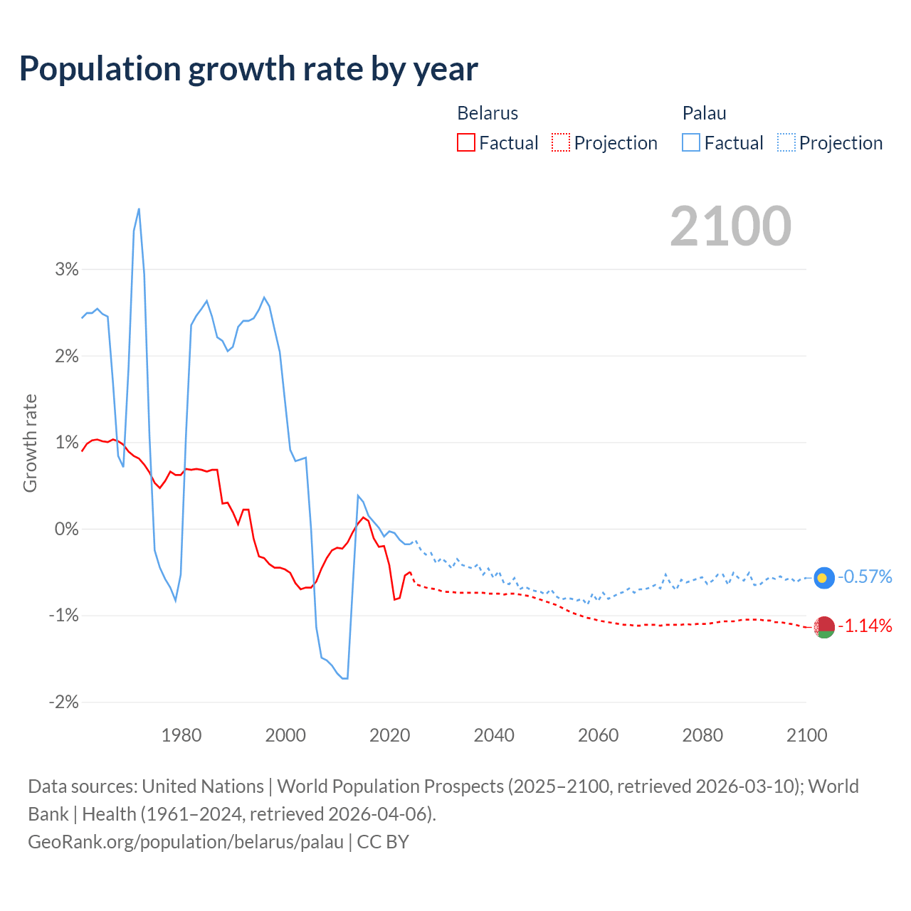 - For the last 10 years, Belarus has had an average growth rate of -0.3% per year vs +0.02% in Palau.