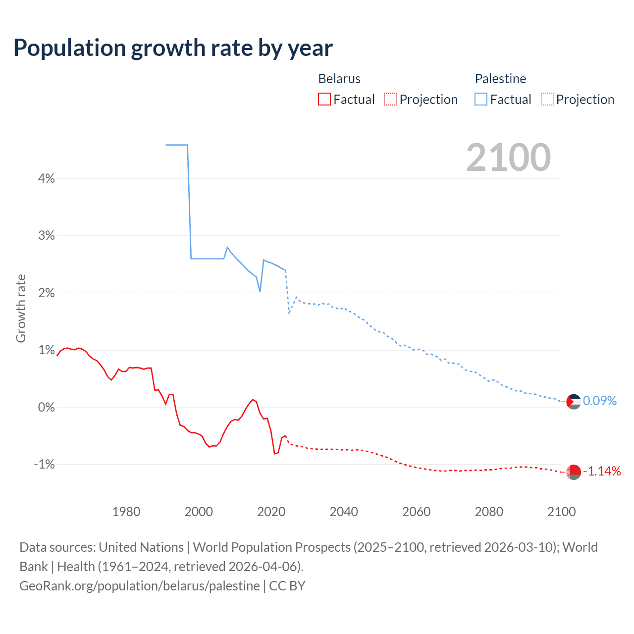 - For the last 10 years, Belarus has had an average growth rate of -0.3% per year vs +2.4% in Palestine.