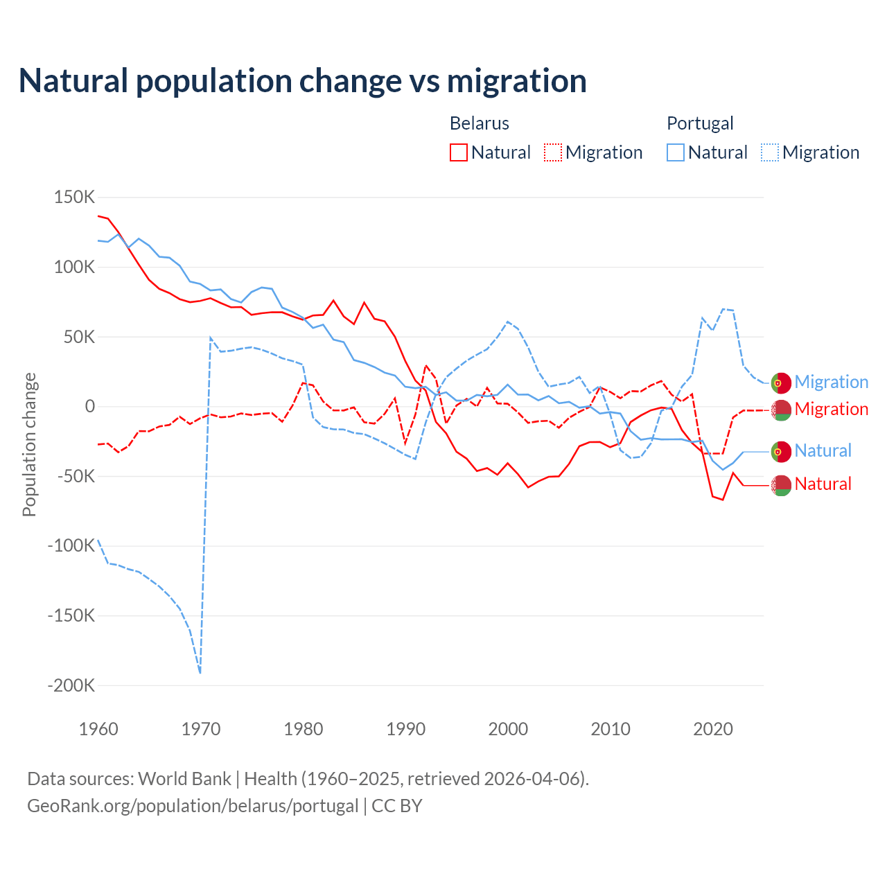 Over the last 10 years, 84.2% of the population change in Belarus is from natural causes (a loss of 318,682 people) and 15.8% is from migration (a loss of 59,605 people). In Portugal 51% is from natural causes (a loss of 302,748 people) and 49% is from migration (a gain of 290,554 people).