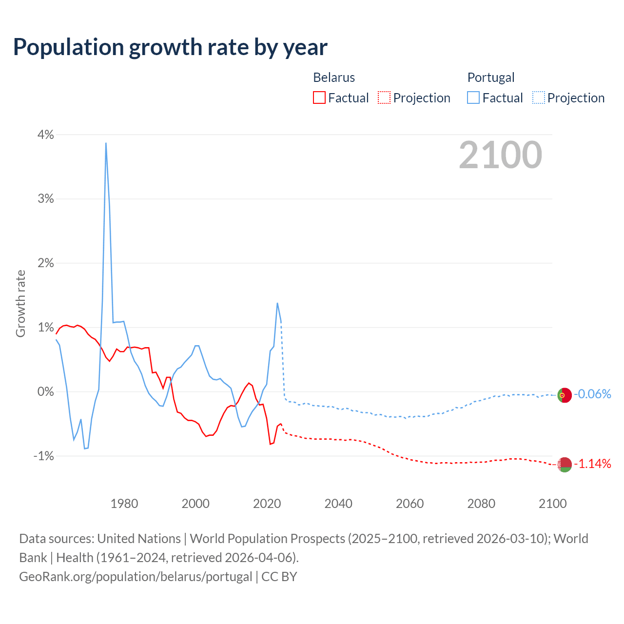 - For the last 10 years, Belarus has had an average growth rate of -0.3% per year vs +0.21% in Portugal.