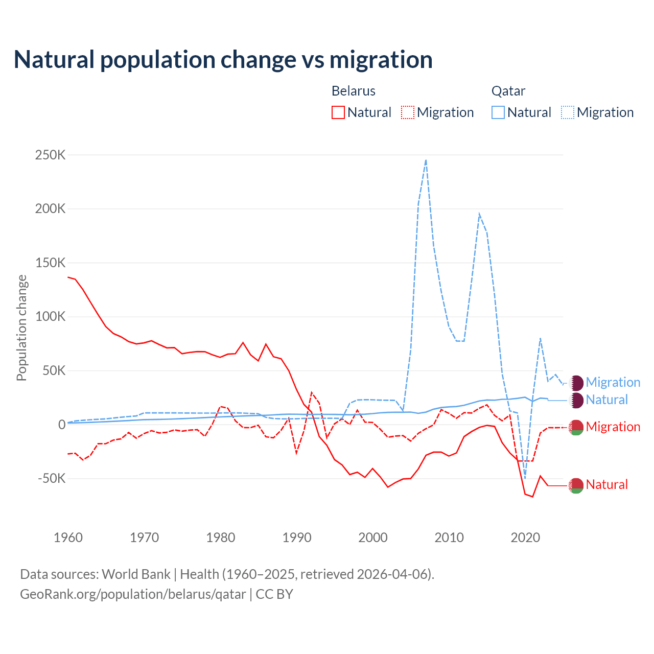Over the last 10 years, 84.2% of the population change in Belarus is from natural causes (a loss of 318,682 people) and 15.8% is from migration (a loss of 59,605 people). In Qatar 26.1% is from natural causes (a gain of 232,009 people) and 73.9% is from migration (a gain of 655,712 people).