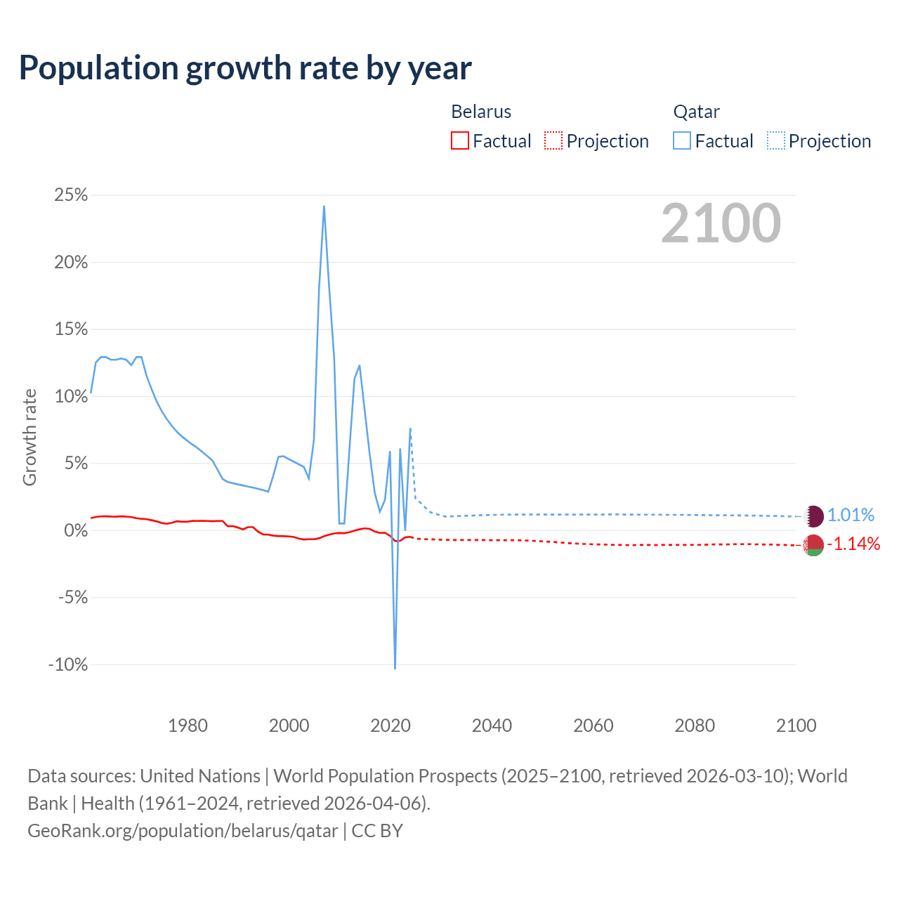 - For the last 10 years, Belarus has had an average growth rate of -0.3% per year vs +3.86% in Qatar.