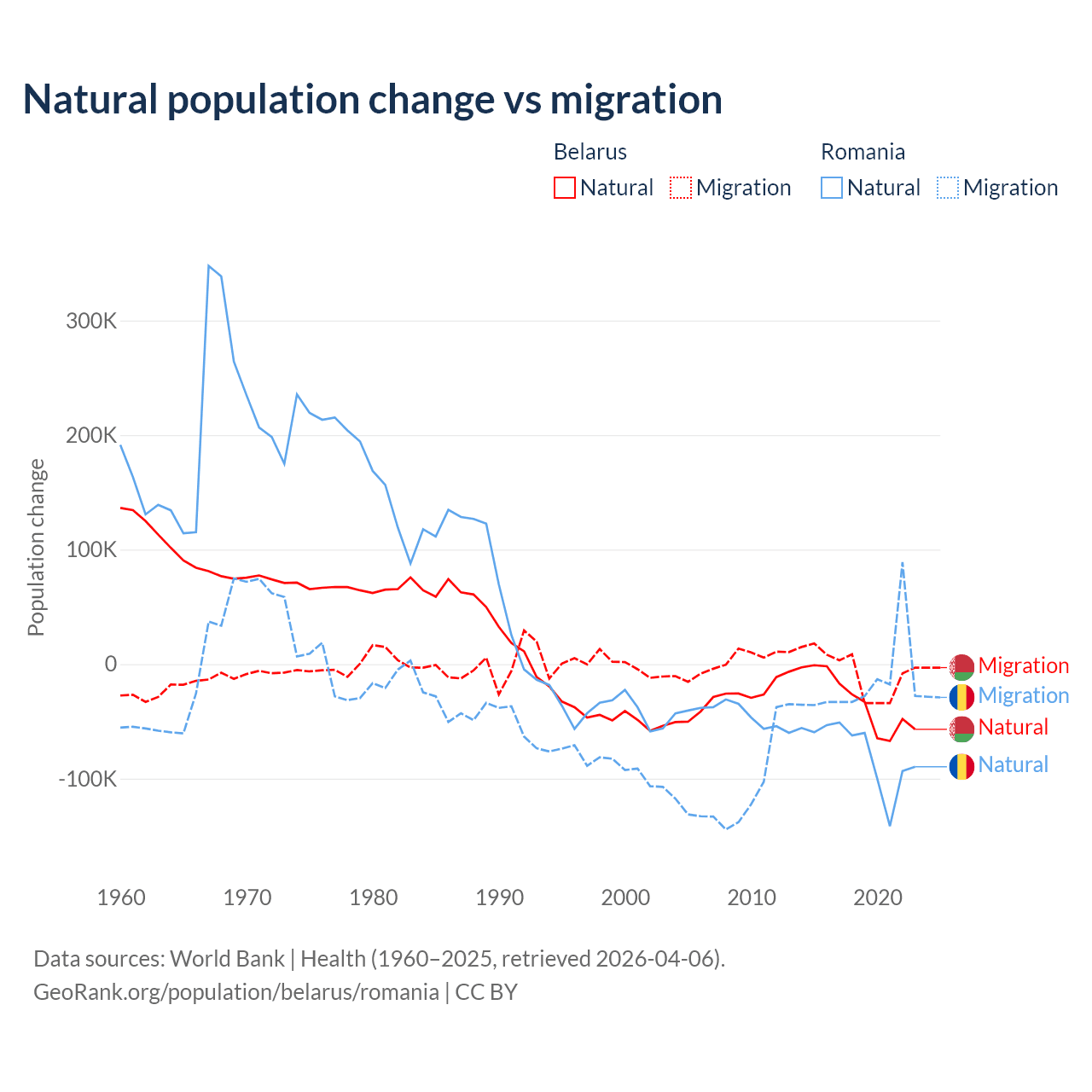 Over the last 10 years, 84.2% of the population change in Belarus is from natural causes (a loss of 318,682 people) and 15.8% is from migration (a loss of 59,605 people). In Romania 82% is from natural causes (a loss of 766,295 people) and 18% is from migration (a loss of 167,917 people).