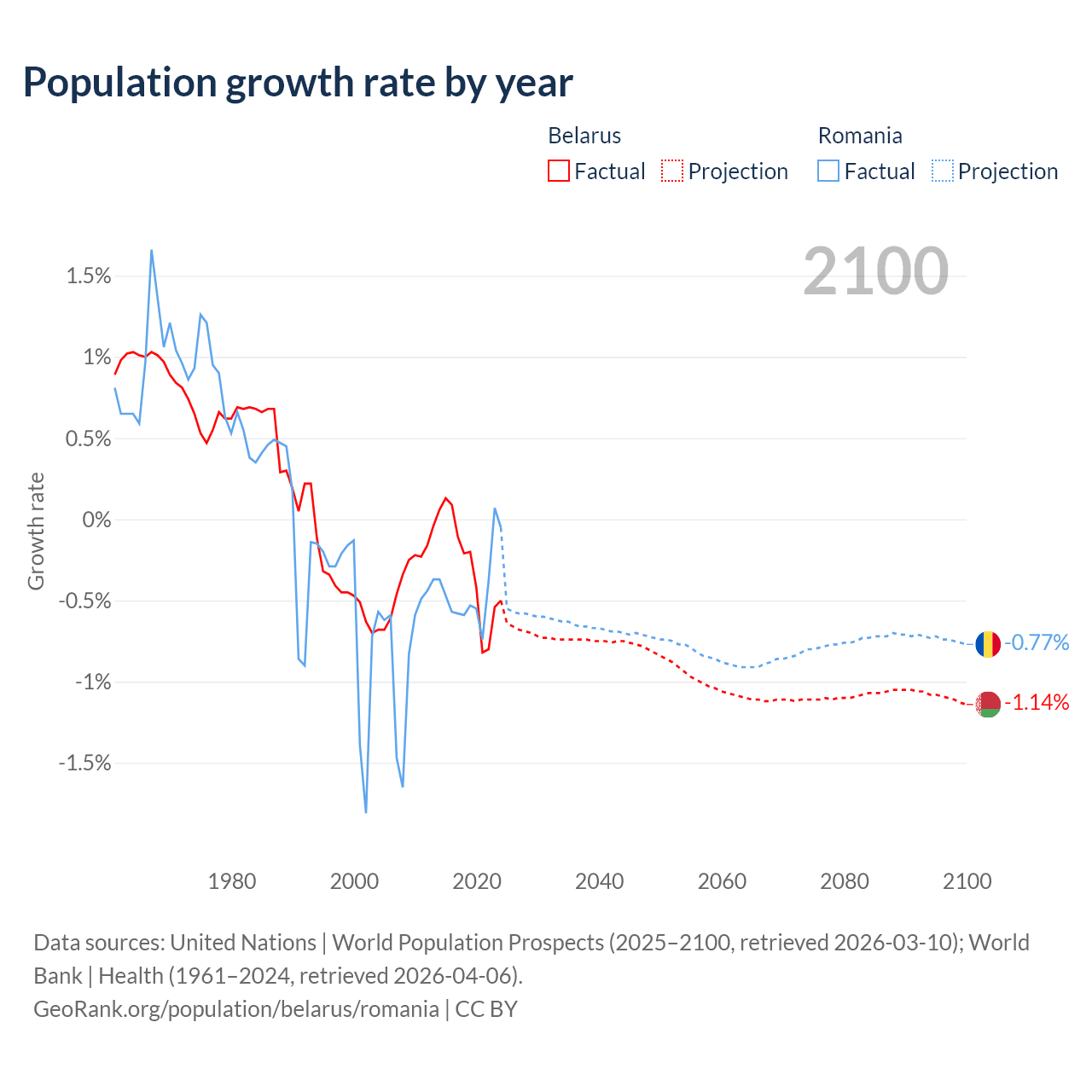 - For the last 10 years, Belarus has had an average growth rate of -0.3% per year vs -0.43% in Romania.
