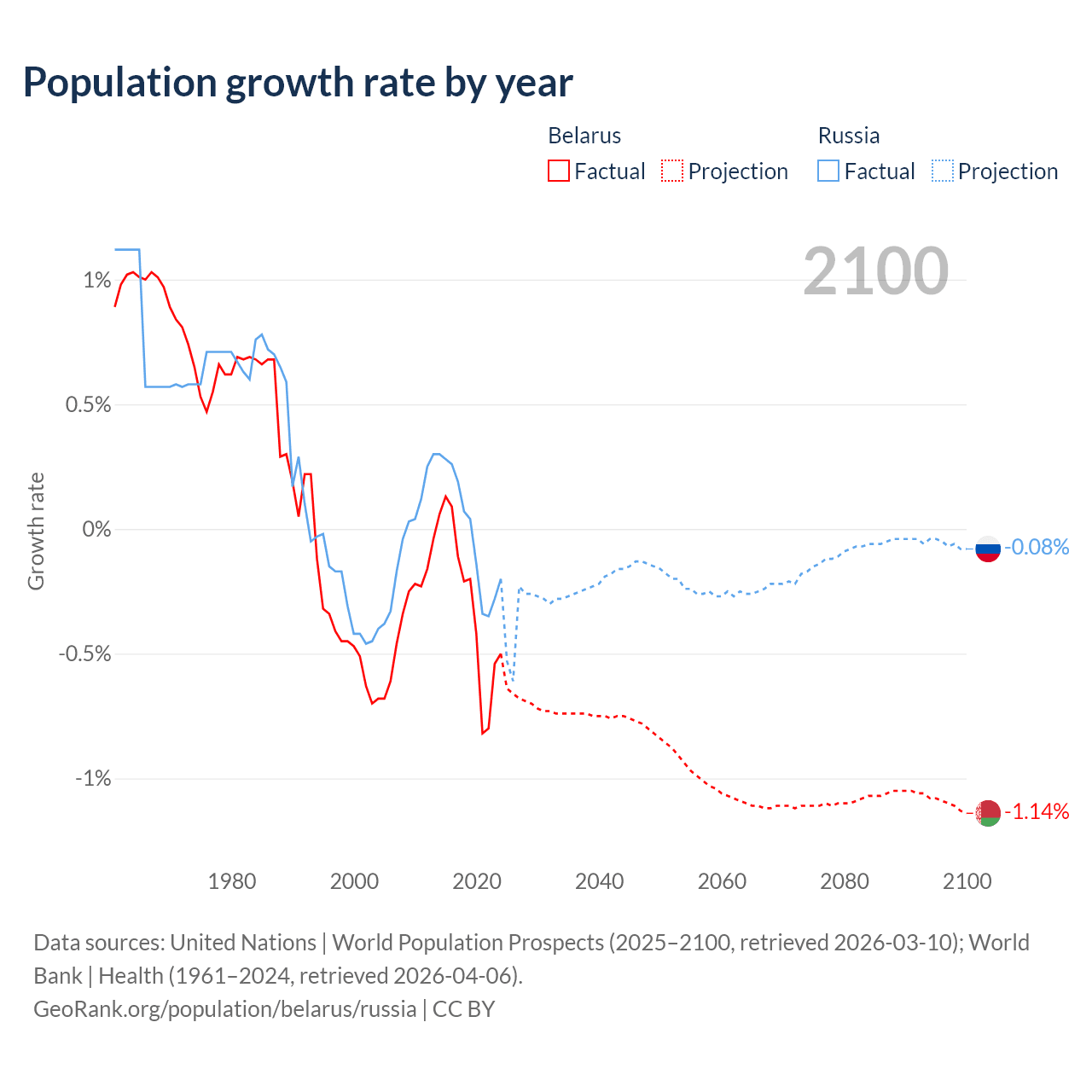 - For the last 10 years, Belarus has had an average growth rate of -0.3% per year vs -0.02% in Russia.