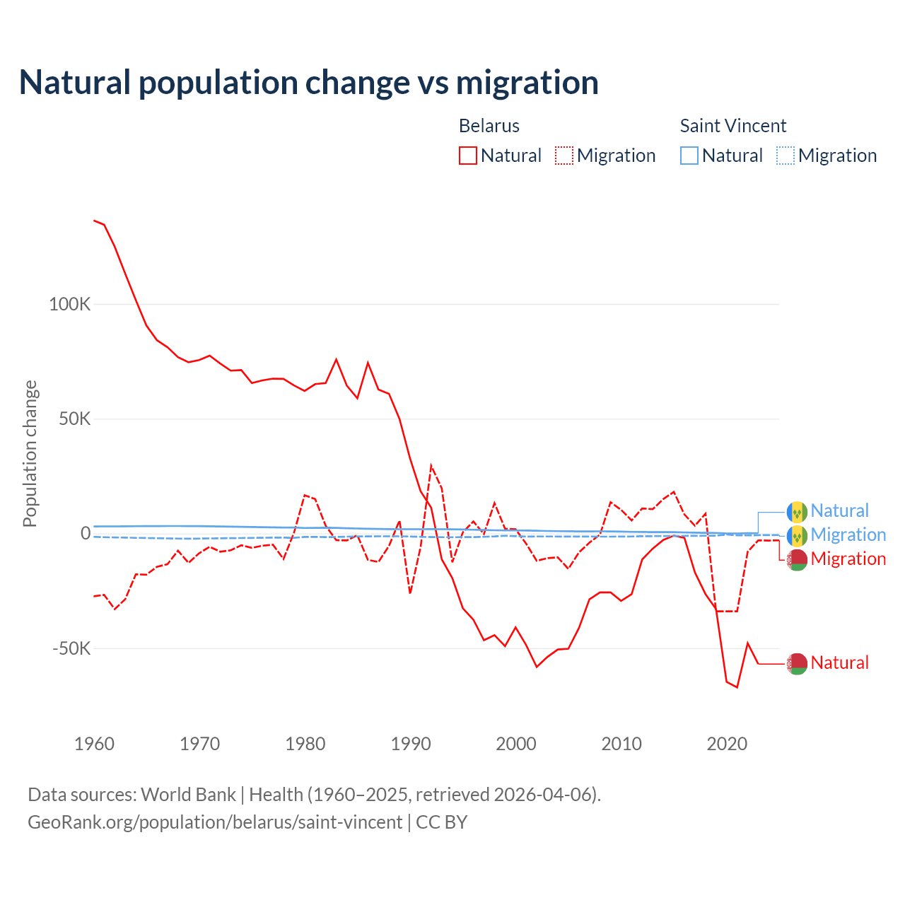 Over the last 10 years, 84.2% of the population change in Belarus is from natural causes (a loss of 318,682 people) and 15.8% is from migration (a loss of 59,605 people). In Saint Vincent 21.2% is from natural causes (a gain of 2,525 people) and 78.8% is from migration (a loss of 9,393 people).