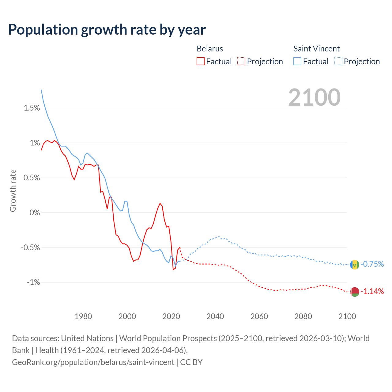 - For the last 10 years, Belarus has had an average growth rate of -0.3% per year vs -0.65% in Saint Vincent.