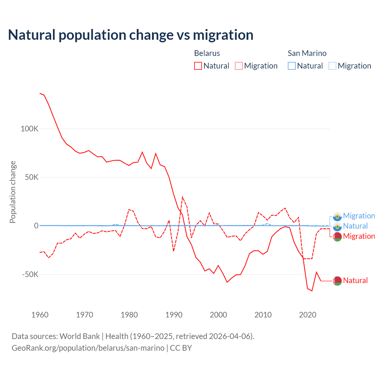 Over the last 10 years, 84.2% of the population change in Belarus is from natural causes (a loss of 318,682 people) and 15.8% is from migration (a loss of 59,605 people). In San Marino 40.9% is from natural causes (a loss of 358 people) and 59.1% is from migration (a gain of 517 people).