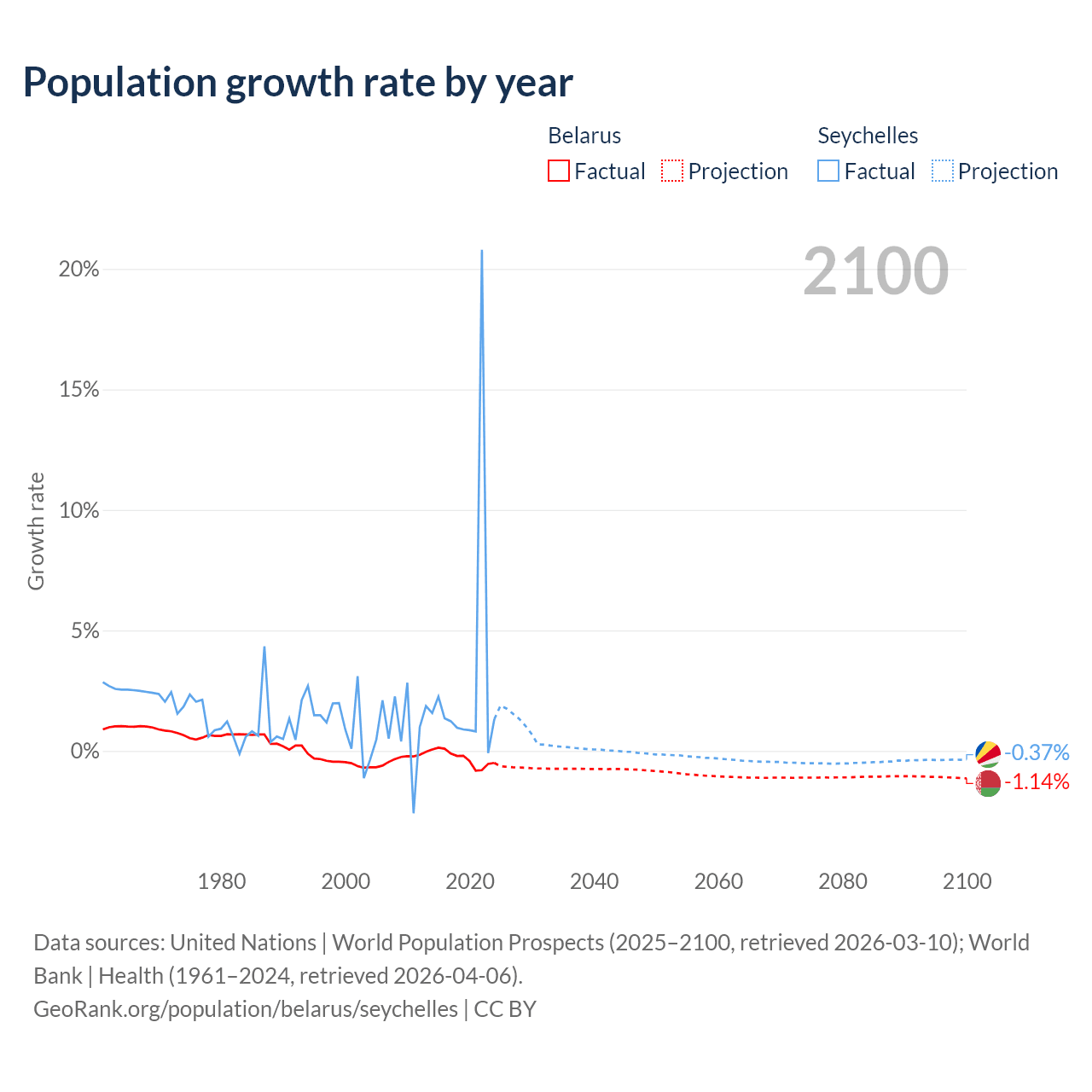 - Since 2006, the population of Belarus has decreased from 9.6M people to 9.01M (6.15% decline), while the Seychelles has grown from 84.6K to 126K (49.3% growth).
