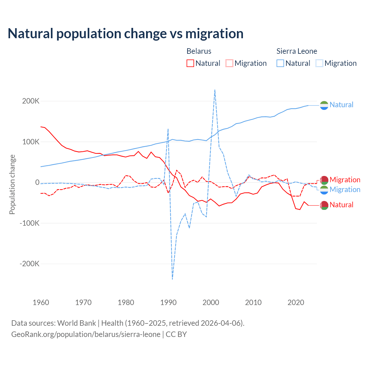 Over the last 10 years, 84.2% of the population change in Belarus is from natural causes (a loss of 318,682 people) and 15.8% is from migration (a loss of 59,605 people). In Sierra Leone 99.6% is from natural causes (a gain of 1,764,049 people) and 0.41% is from migration (a loss of 7,211 people).