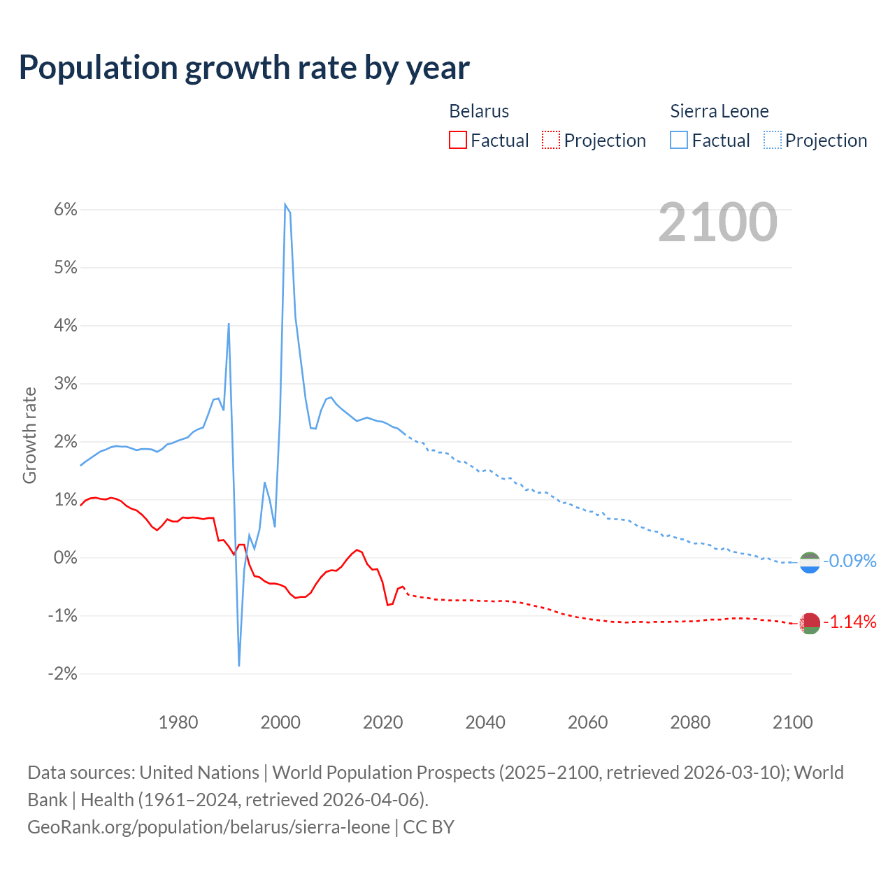 - Since 2006, the population of Belarus has decreased from 9.6M people to 9.01M (6.15% decline), while Sierra Leone has grown from 5.62M to 9.05M (60.9% growth).