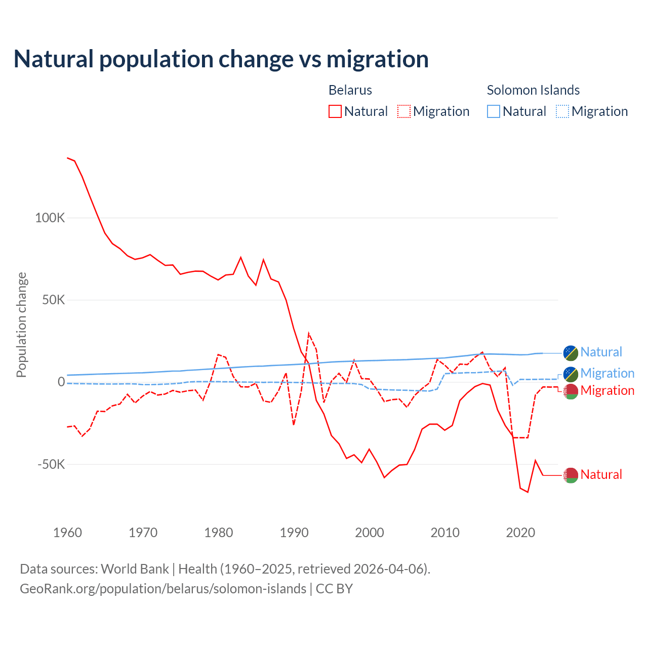 Over the last 10 years, 84.2% of the population change in Belarus is from natural causes (a loss of 318,682 people) and 15.8% is from migration (a loss of 59,605 people). In the Solomon Islands 82.8% is from natural causes (a gain of 168,727 people) and 17.2% is from migration (a gain of 35,031 people).