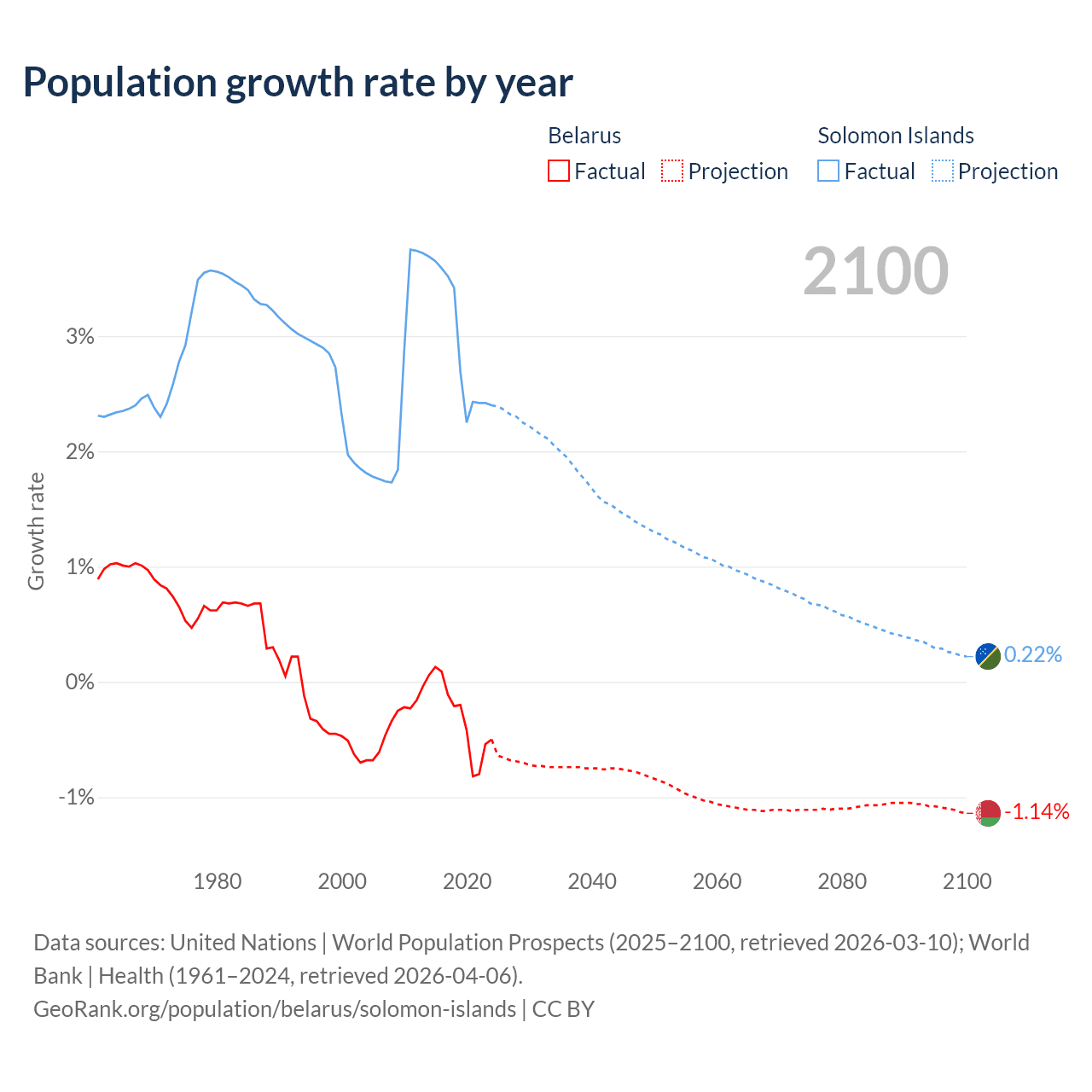 - For the last 10 years, Belarus has had an average growth rate of -0.3% per year vs +2.95% in the Solomon Islands.