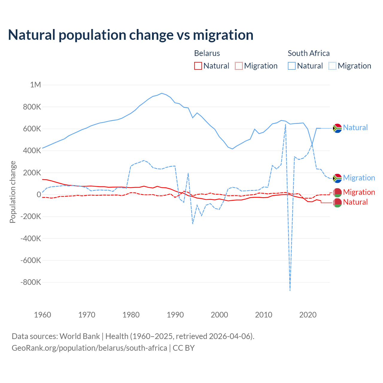 Over the last 10 years, 84.2% of the population change in Belarus is from natural causes (a loss of 318,682 people) and 15.8% is from migration (a loss of 59,605 people). In South Africa 72.8% is from natural causes (a gain of 6,190,027 people) and 27.2% is from migration (a gain of 2,316,795 people).