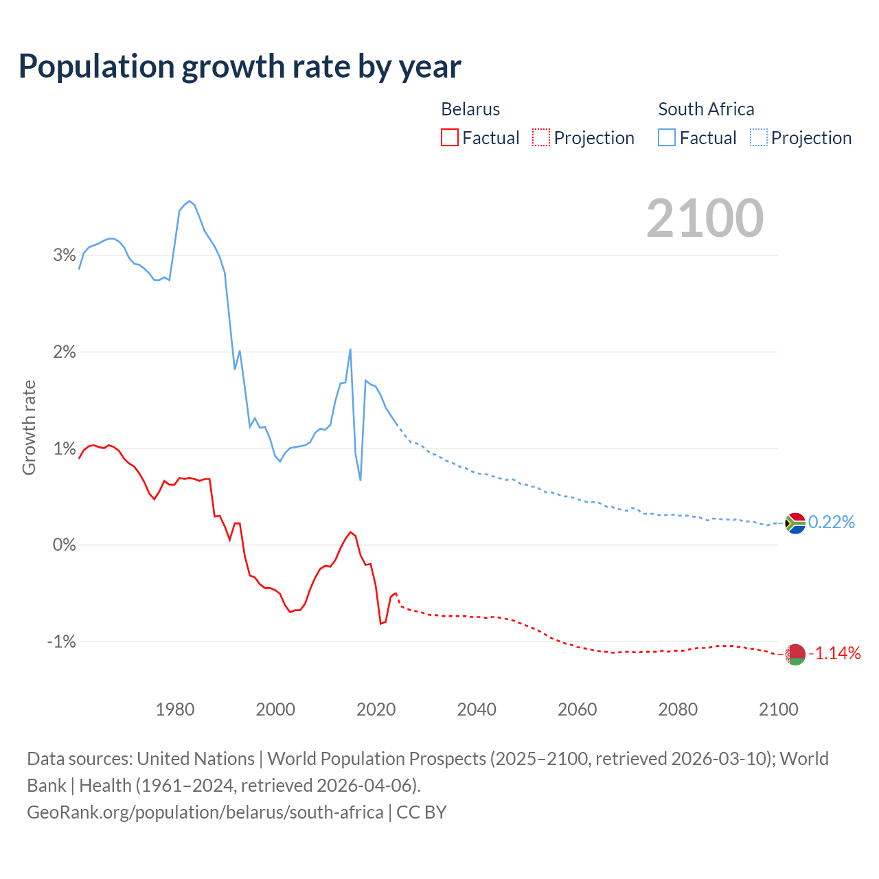 - For the last 10 years, Belarus has had an average growth rate of -0.3% per year vs +1.44% in South Africa.