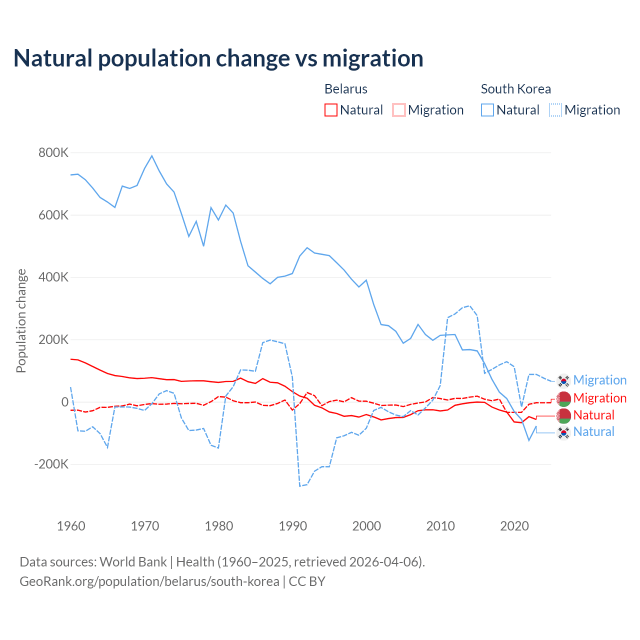 Over the last 10 years, 84.2% of the population change in Belarus is from natural causes (a loss of 318,682 people) and 15.8% is from migration (a loss of 59,605 people). In South Korea 17.6% is from natural causes (a gain of 277,215 people) and 82.4% is from migration (a gain of 1,298,356 people).