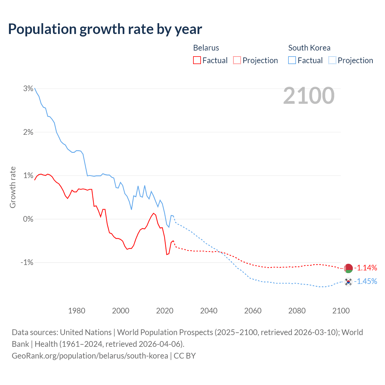 - For the last 10 years, Belarus has had an average growth rate of -0.3% per year vs +0.24% in South Korea.