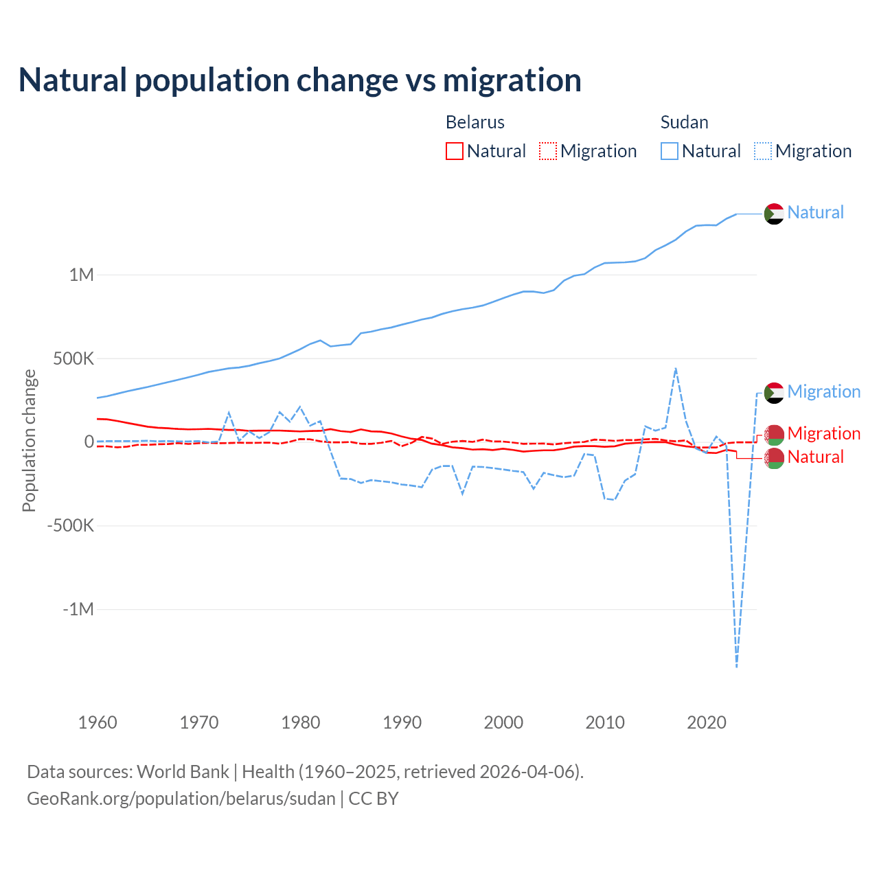 Over the last 10 years, 84.2% of the population change in Belarus is from natural causes (a loss of 318,682 people) and 15.8% is from migration (a loss of 59,605 people). In Sudan 95.1% is from natural causes (a gain of 12,459,977 people) and 4.88% is from migration (a loss of 639,596 people).