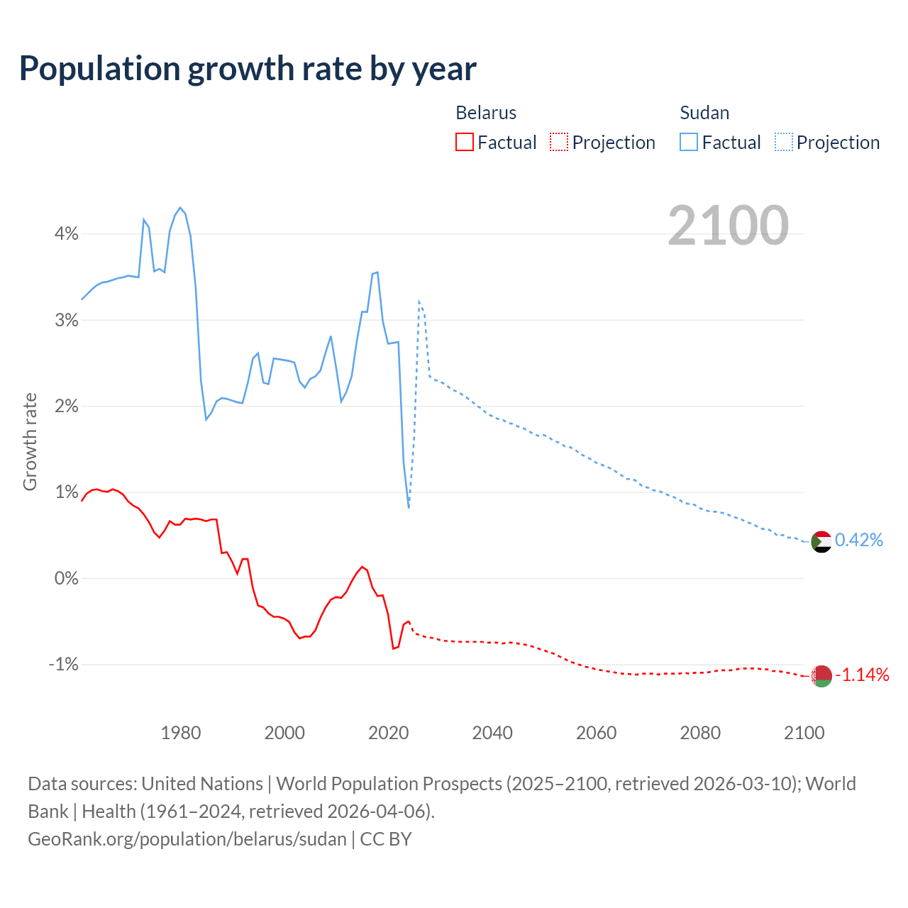 - For the last 10 years, Belarus has had an average growth rate of -0.3% per year vs +2.67% in Sudan.