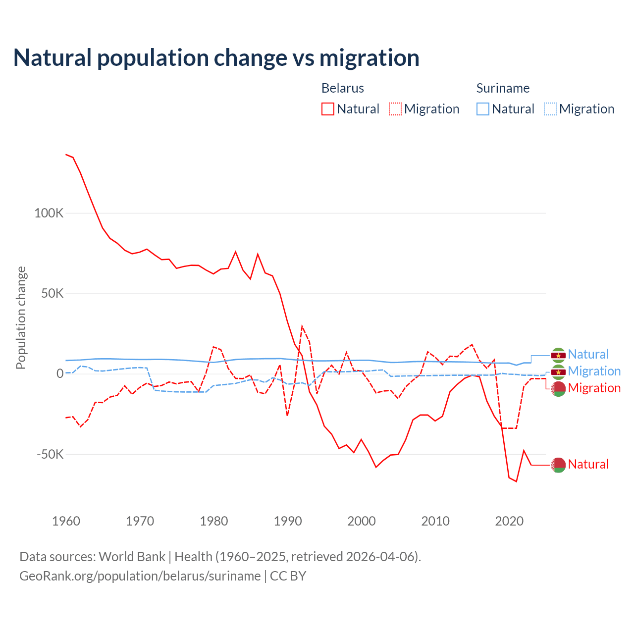Over the last 10 years, 84.2% of the population change in Belarus is from natural causes (a loss of 318,682 people) and 15.8% is from migration (a loss of 59,605 people). In Suriname 90.3% is from natural causes (a gain of 66,709 people) and 9.72% is from migration (a loss of 7,185 people).