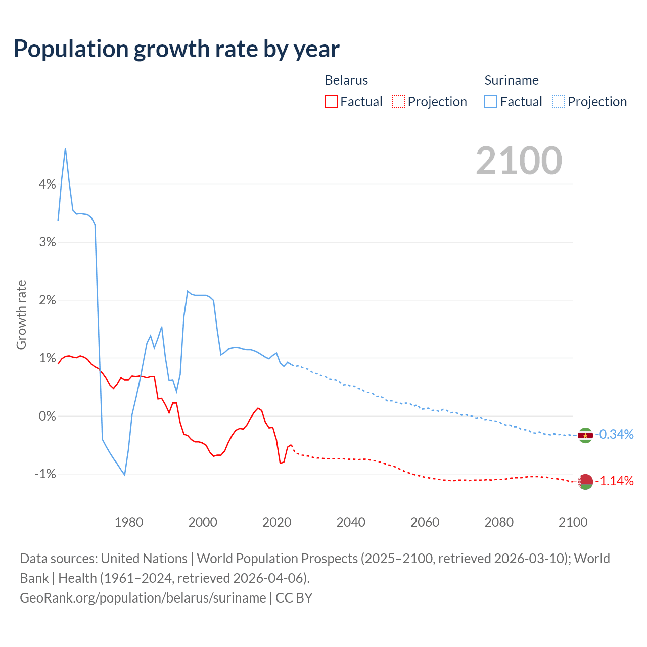 - For the last 10 years, Belarus has had an average growth rate of -0.3% per year vs +0.99% in Suriname.