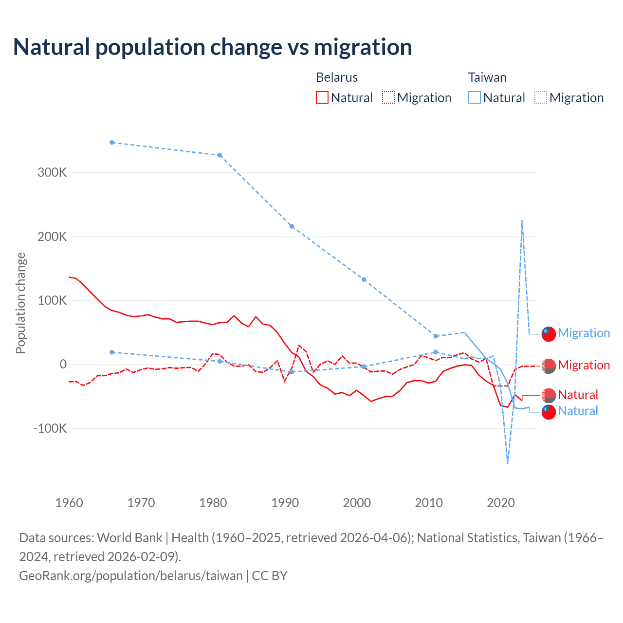 Over the last 10 years, 84.2% of the population change in Belarus is from natural causes (a loss of 318,682 people) and 15.8% is from migration (a loss of 59,605 people). In Taiwan 56.7% is from natural causes (a loss of 57,467 people) and 43.3% is from migration (a gain of 43,884 people).