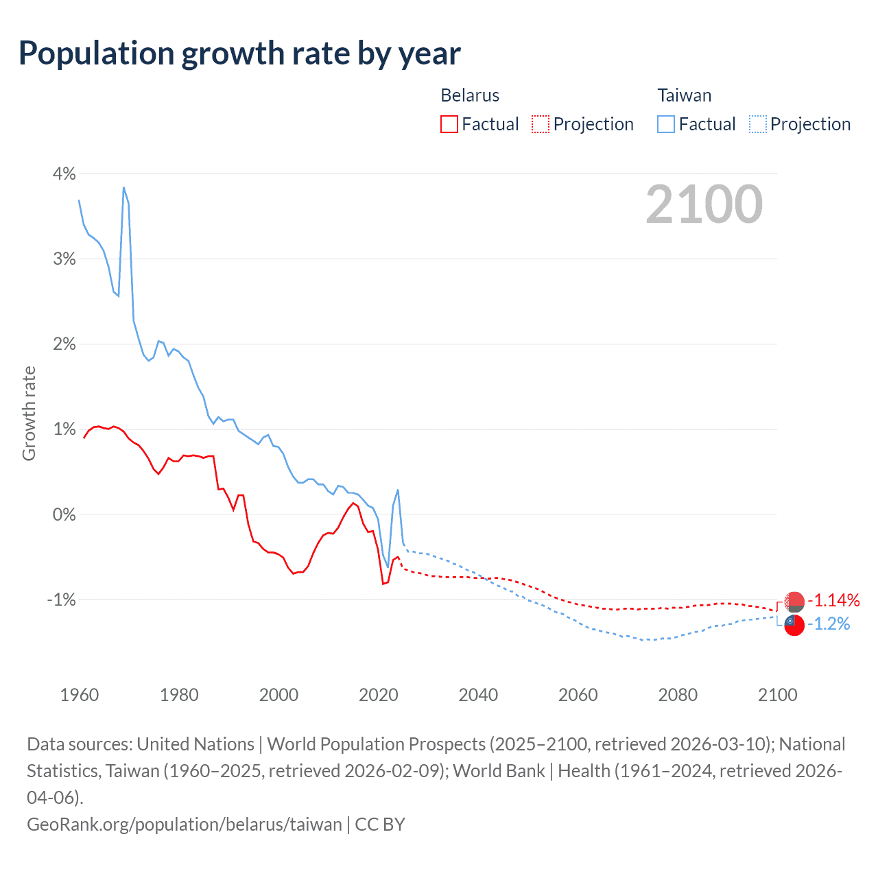 - For the last 10 years, Belarus has had an average growth rate of -0.3% per year vs -0.03% in Taiwan.