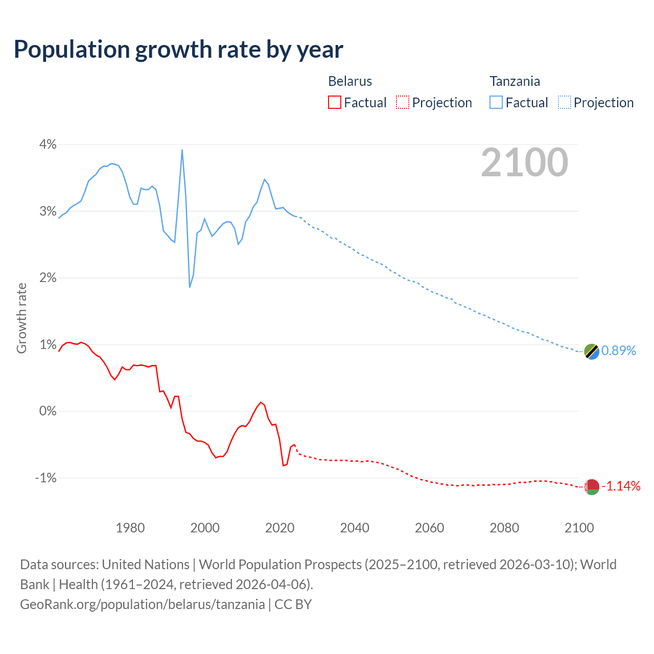 - Since 2006, the population of Belarus has decreased from 9.6M people to 9.01M (6.15% decline), while Tanzania has grown from 40.3M to 73.1M (81.5% growth).
