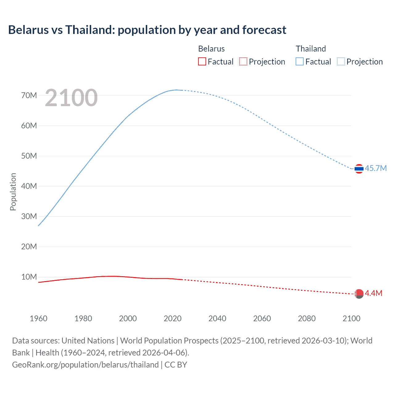 The latest officially reported population of Belarus was 9,132,629 in 2024 vs 71,668,011 people in Thailand in 2024. In 2026, based on the adjusted UN estimation, the current Belarus' population is 9,013,835 people compared to 71,571,743 in Thailand.