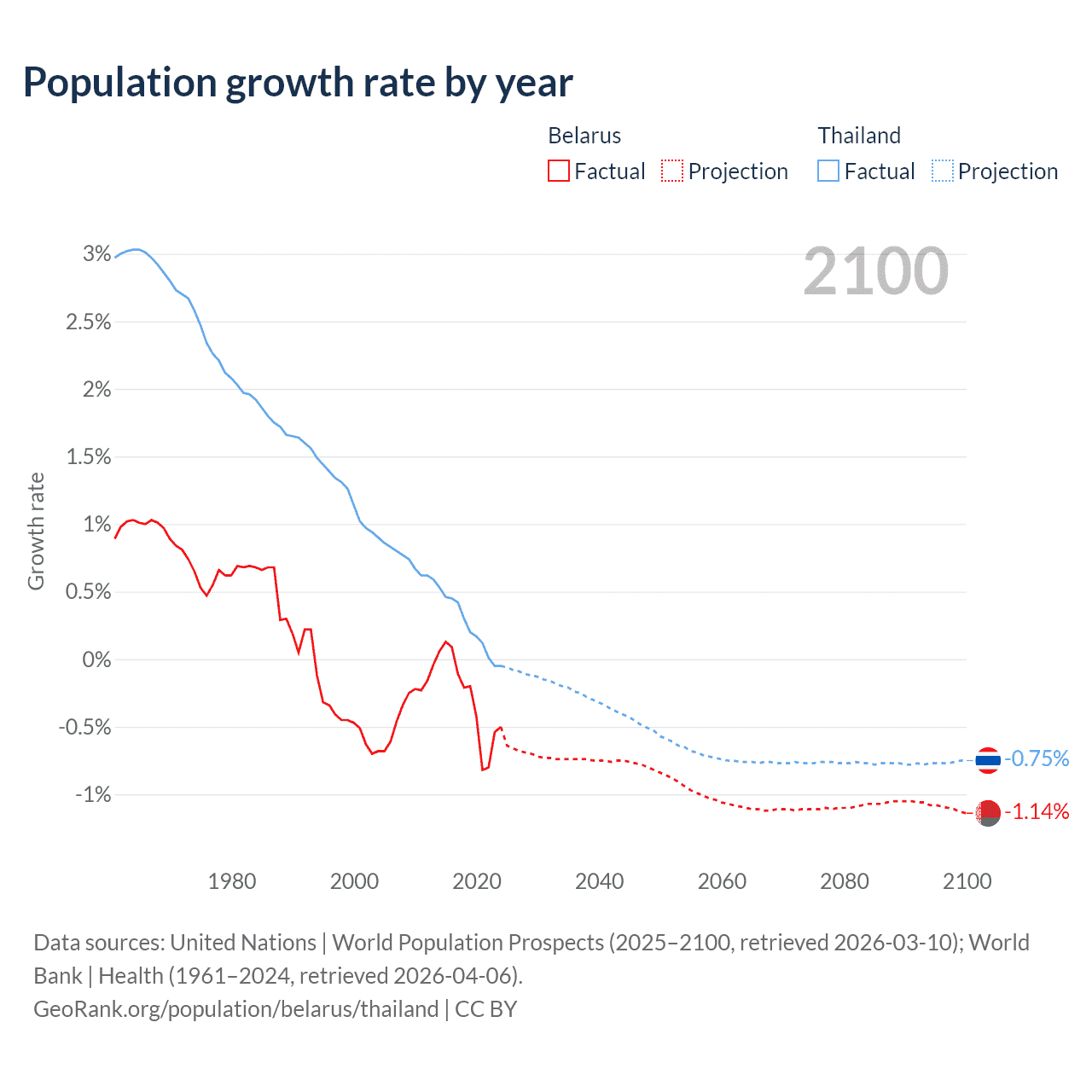 - For the last 10 years, Belarus has had an average growth rate of -0.3% per year vs +0.23% in Thailand.