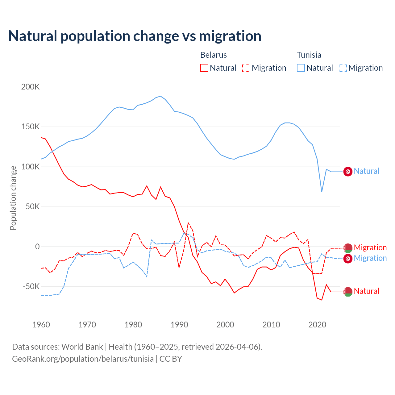 Over the last 10 years, 84.2% of the population change in Belarus is from natural causes (a loss of 318,682 people) and 15.8% is from migration (a loss of 59,605 people). In Tunisia 86.3% is from natural causes (a gain of 1,225,079 people) and 13.7% is from migration (a loss of 195,011 people).
