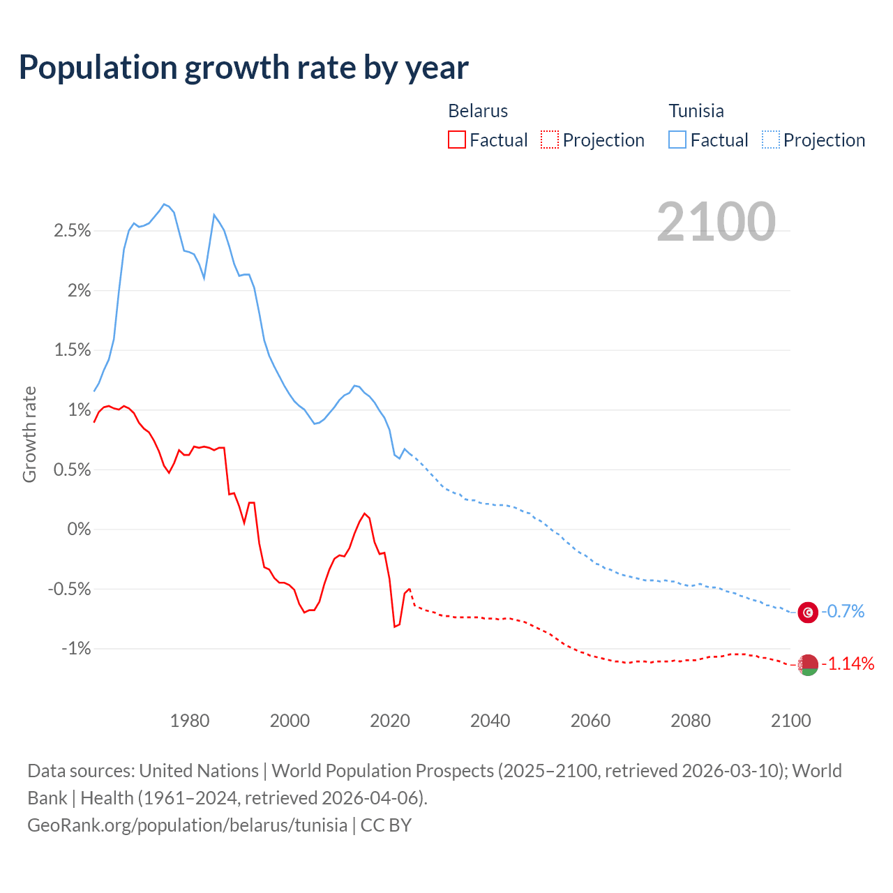 - Since 2006, the population of Belarus has decreased from 9.6M people to 9.01M (6.15% decline), while Tunisia has grown from 10.3M to 12.4M (20.2% growth).