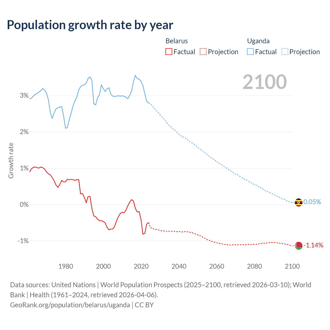 - For the last 10 years, Belarus has had an average growth rate of -0.3% per year vs +3.21% in Uganda.