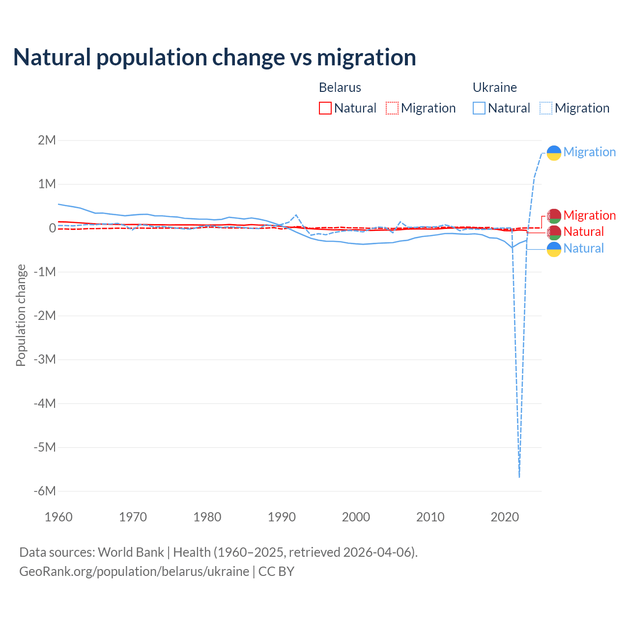 Over the last 10 years, 84.2% of the population change in Belarus is from natural causes (a loss of 318,682 people) and 15.8% is from migration (a loss of 59,605 people). In Ukraine 28.2% is from natural causes (a loss of 2,435,153 people) and 71.8% is from migration (a loss of 6,198,995 people).