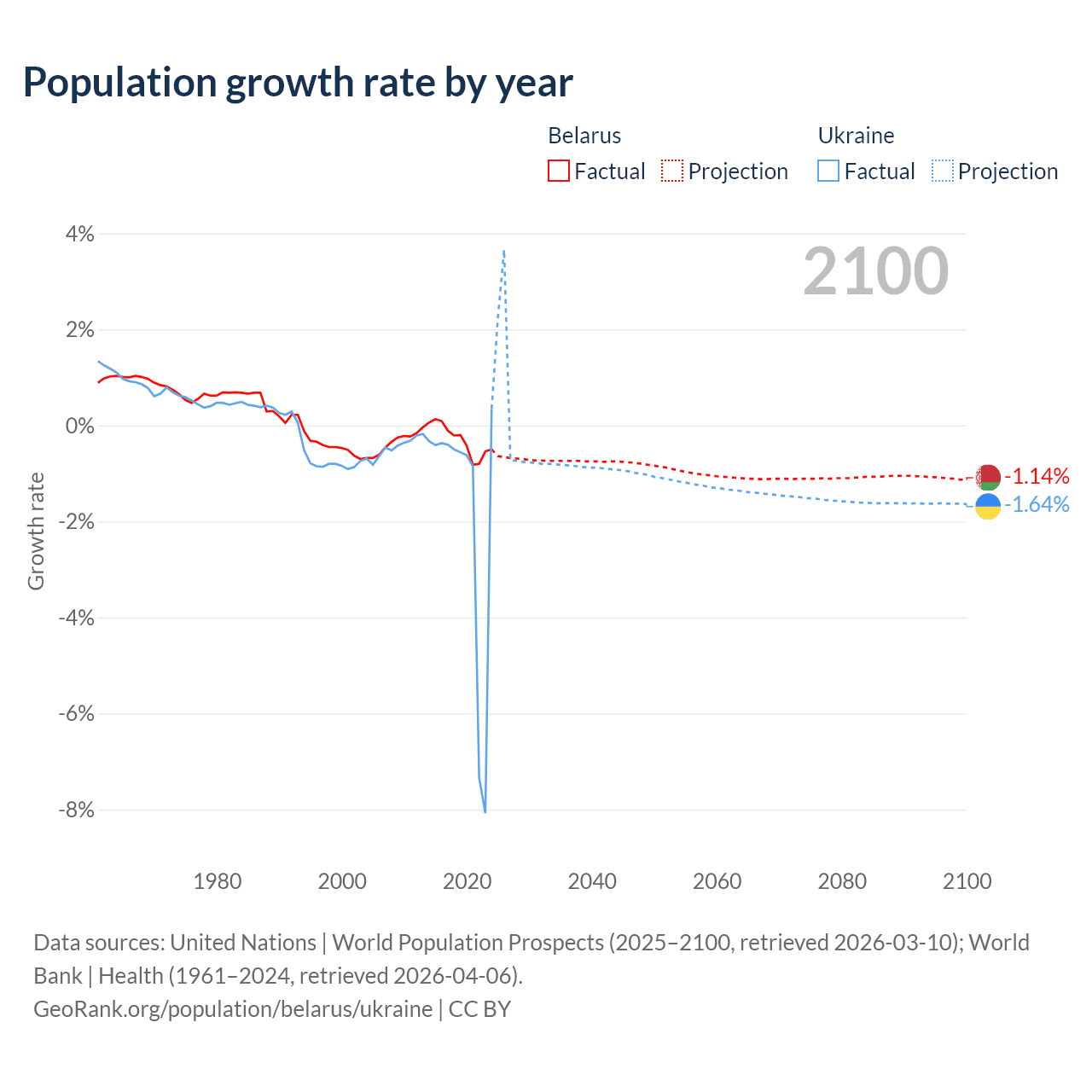 - For the last 10 years, Belarus has had an average growth rate of -0.3% per year vs -1.74% in Ukraine.