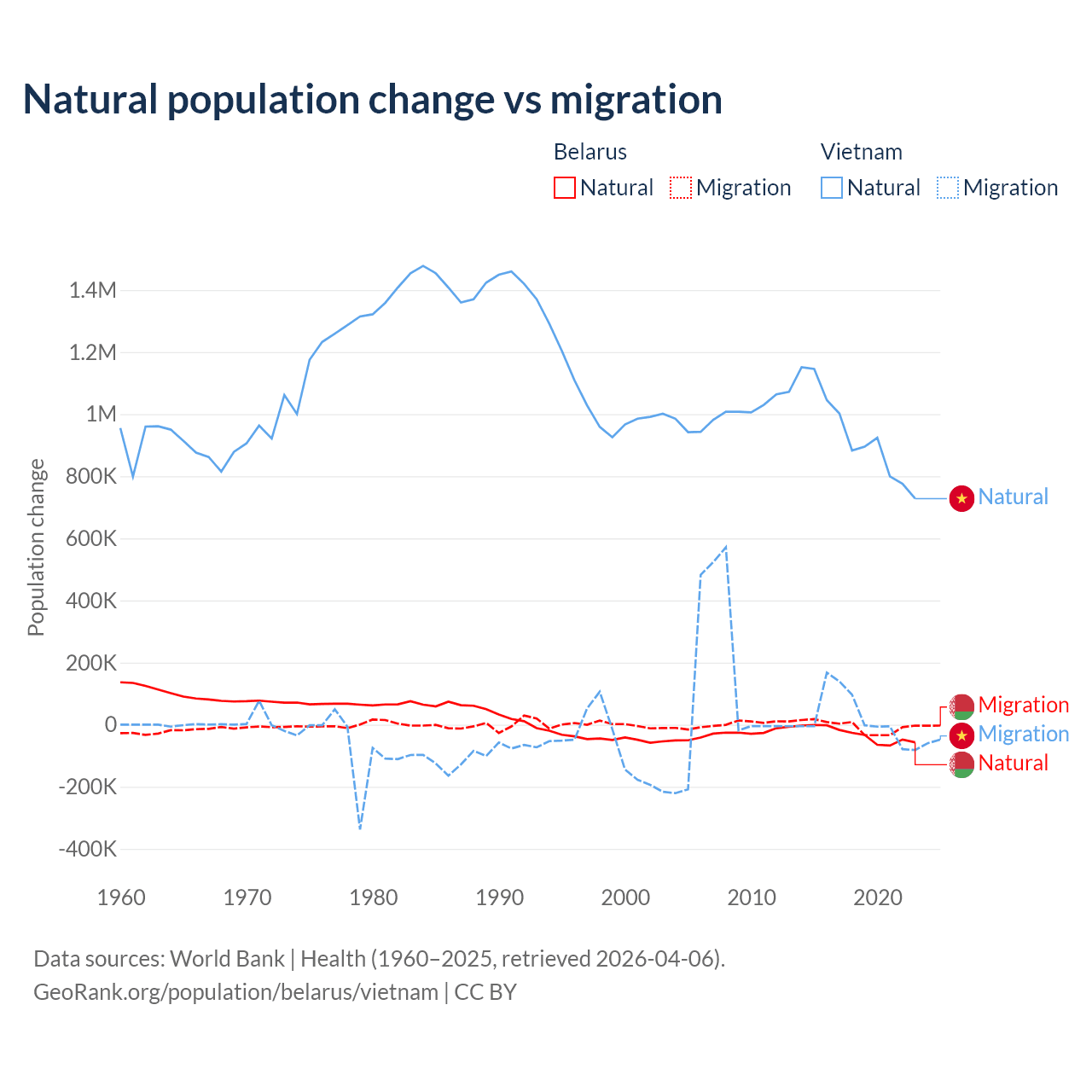 Over the last 10 years, 84.2% of the population change in Belarus is from natural causes (a loss of 318,682 people) and 15.8% is from migration (a loss of 59,605 people). In Vietnam 97.7% is from natural causes (a gain of 9,349,756 people) and 2.29% is from migration (a gain of 219,073 people).