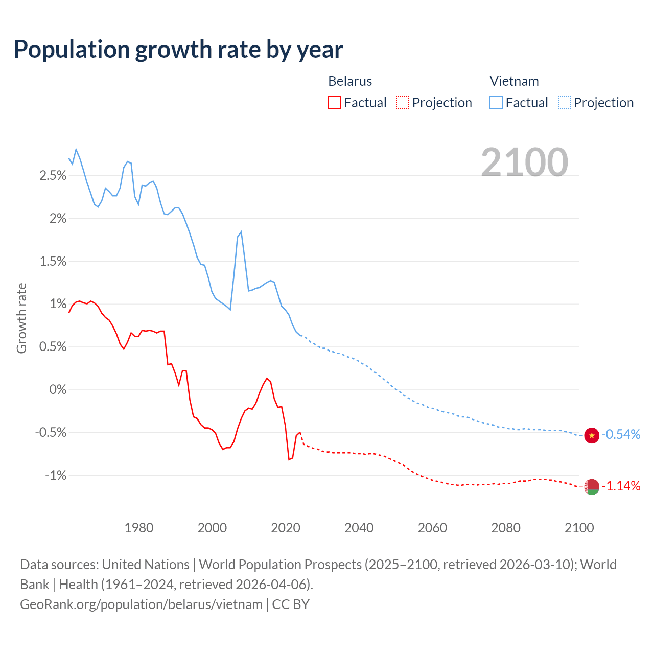 - For the last 10 years, Belarus has had an average growth rate of -0.3% per year vs +0.99% in Vietnam.
